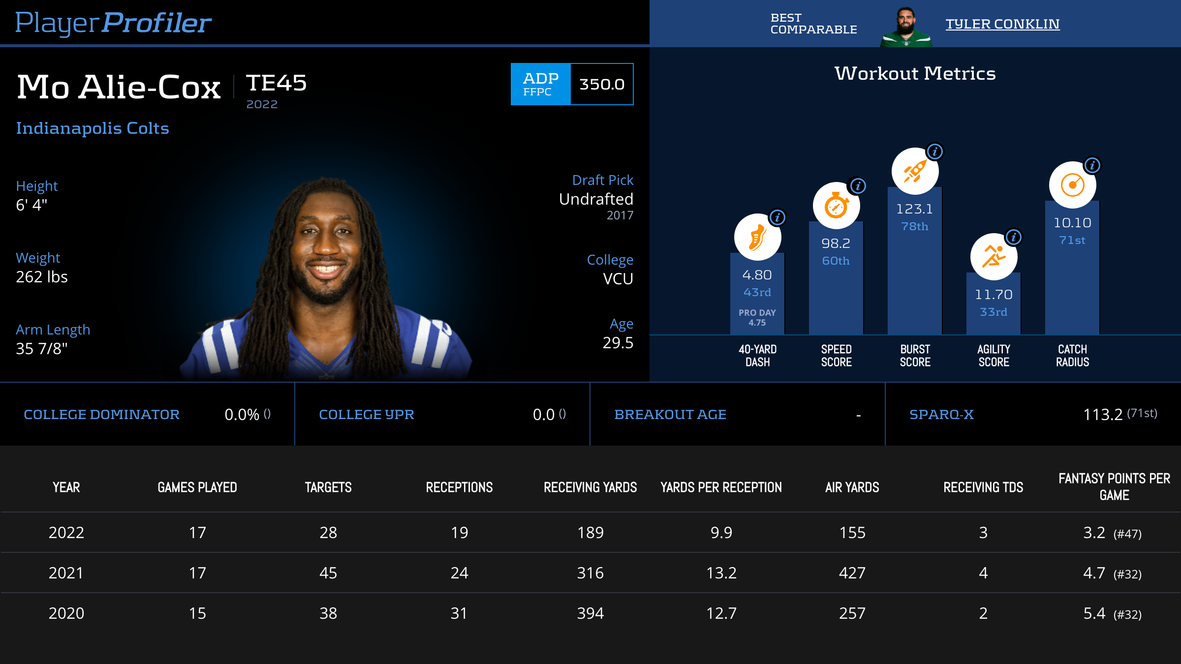 Box score statistics such as targets, yards, touchdowns, and fantasy points per target are updated the next day. Advanced stats and metrics are updated later in the week during the NFL season.