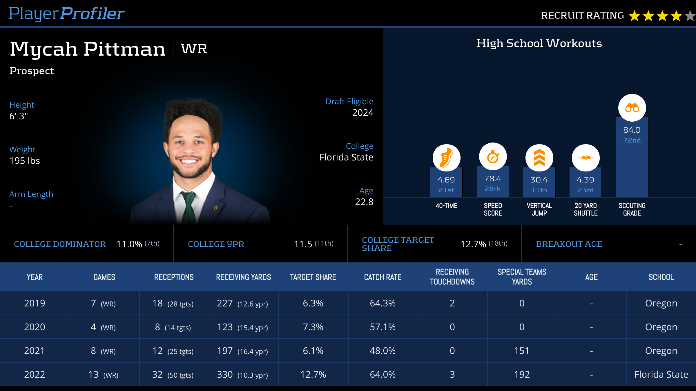 | Year Year | Games Games | Receptions Recs | Receiving Yards Rec Yds | Target Share Tgt Share | Catch Rate Catch Rate | Receiving Touchdowns Rec TDs | Special Teams Yards Special Teams | Age Age | School School |