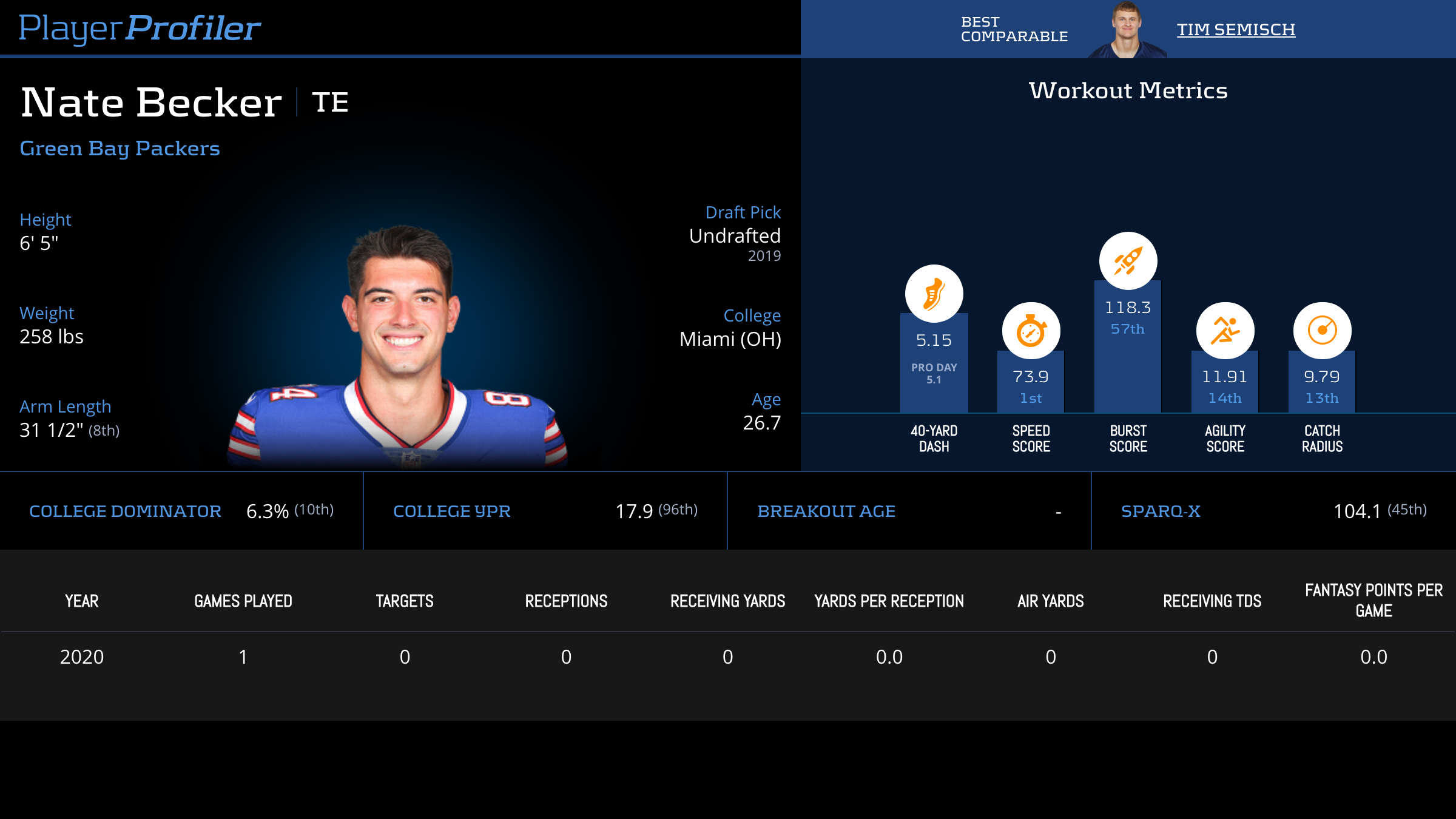 | Year Year | Games Games | Receptions Recs | Receiving Yards Rec Yds | Target Share Tgt Share | Catch Rate Catch Rate | Receiving Touchdowns Rec TDs | Special Teams Yards Special Teams | Age Age | School School |