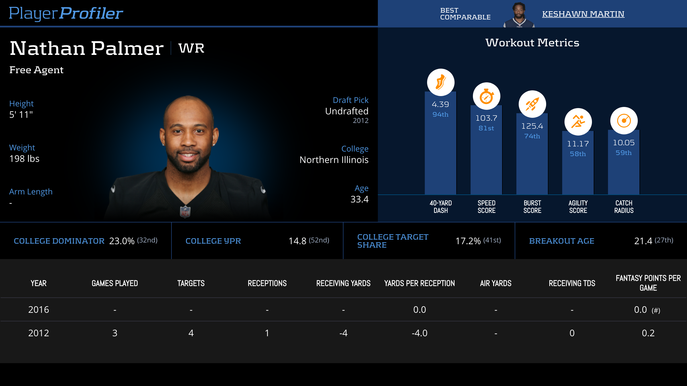 Box score statistics such as targets, yards, touchdowns, and fantasy points per target are updated the next day. Advanced stats and metrics are updated later in the week during the NFL season.