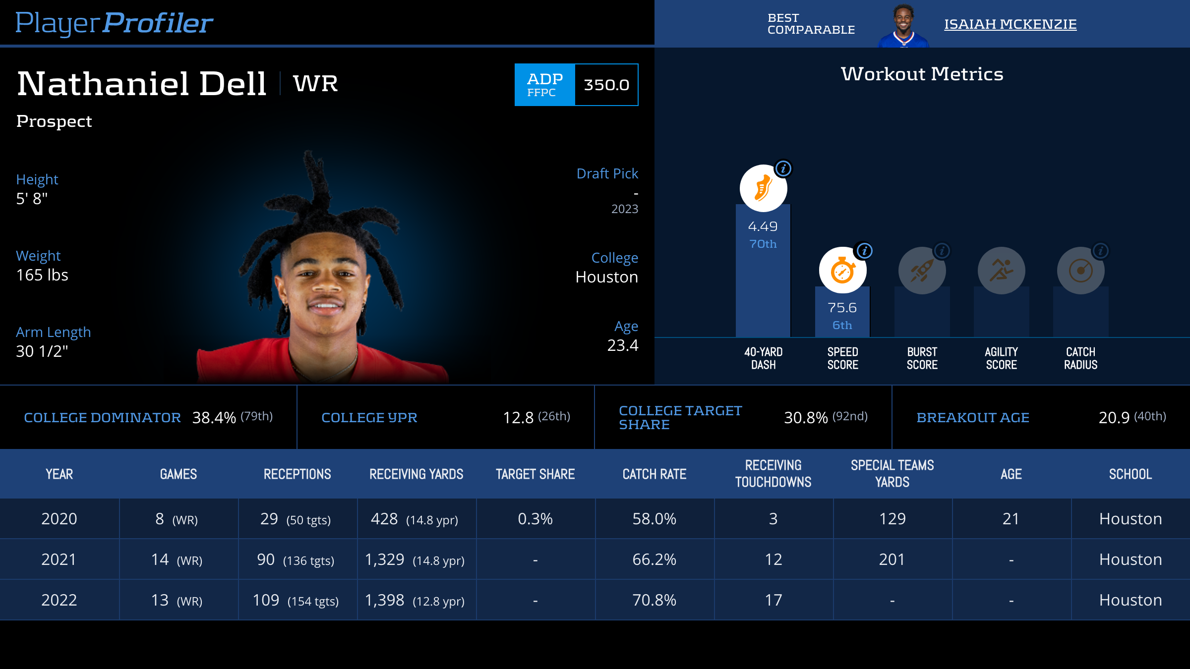| Year Year | Games Games | Receptions Recs | Receiving Yards Rec Yds | Target Share Tgt Share | Catch Rate Catch Rate | Receiving Touchdowns Rec TDs | Special Teams Yards Special Teams | Age Age | School School |
