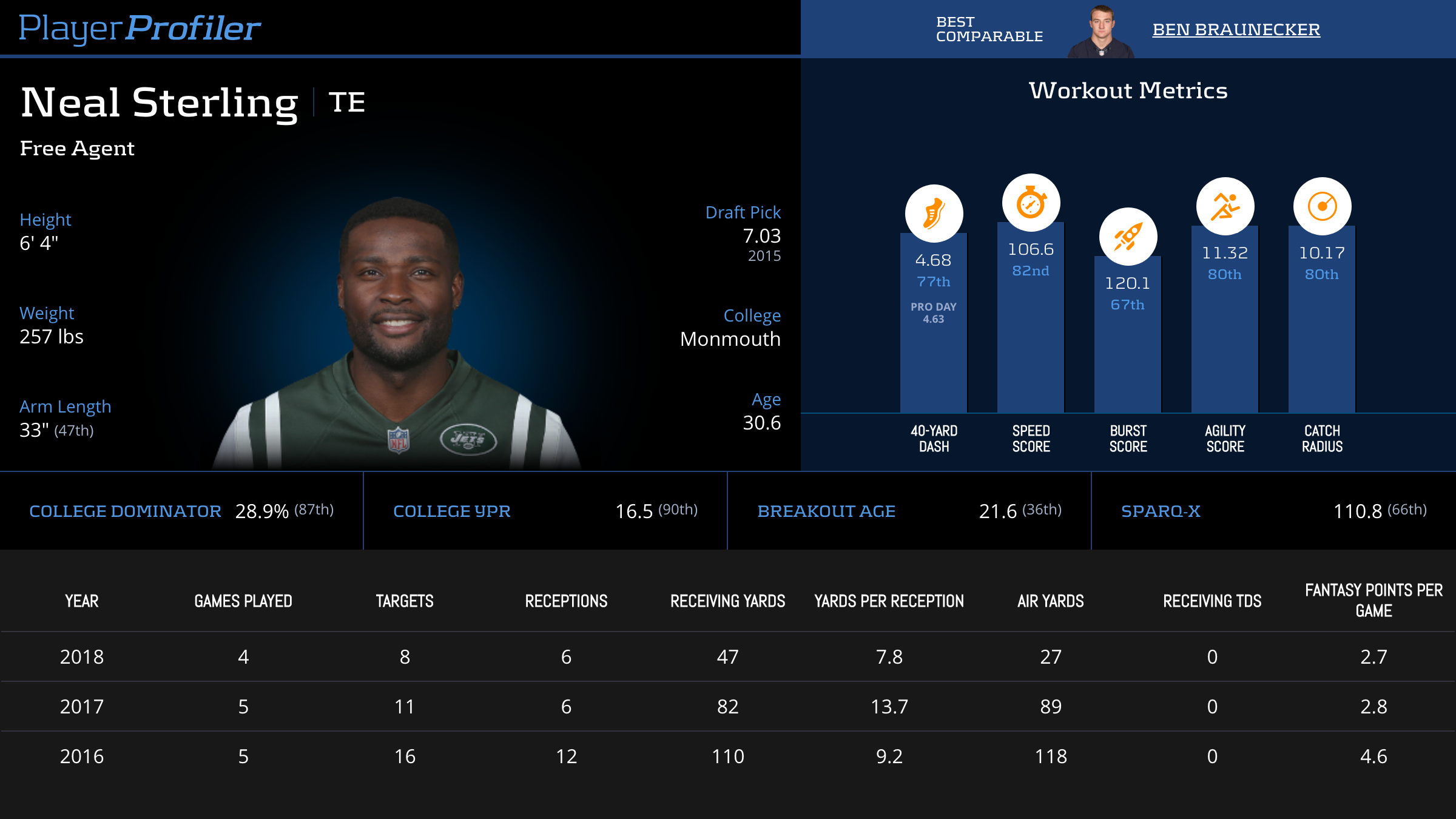 | Year Year | Games Games | Receptions Recs | Receiving Yards Rec Yds | Target Share Tgt Share | Catch Rate Catch Rate | Receiving Touchdowns Rec TDs | Special Teams Yards Special Teams | Age Age | School School |
