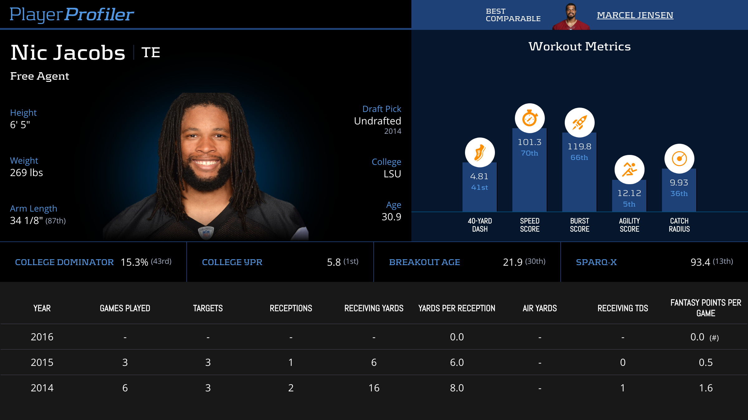 | Year Year | Games Games | Receptions Recs | Receiving Yards Rec Yds | Target Share Tgt Share | Catch Rate Catch Rate | Receiving Touchdowns Rec TDs | Special Teams Yards Special Teams | Age Age | School School |