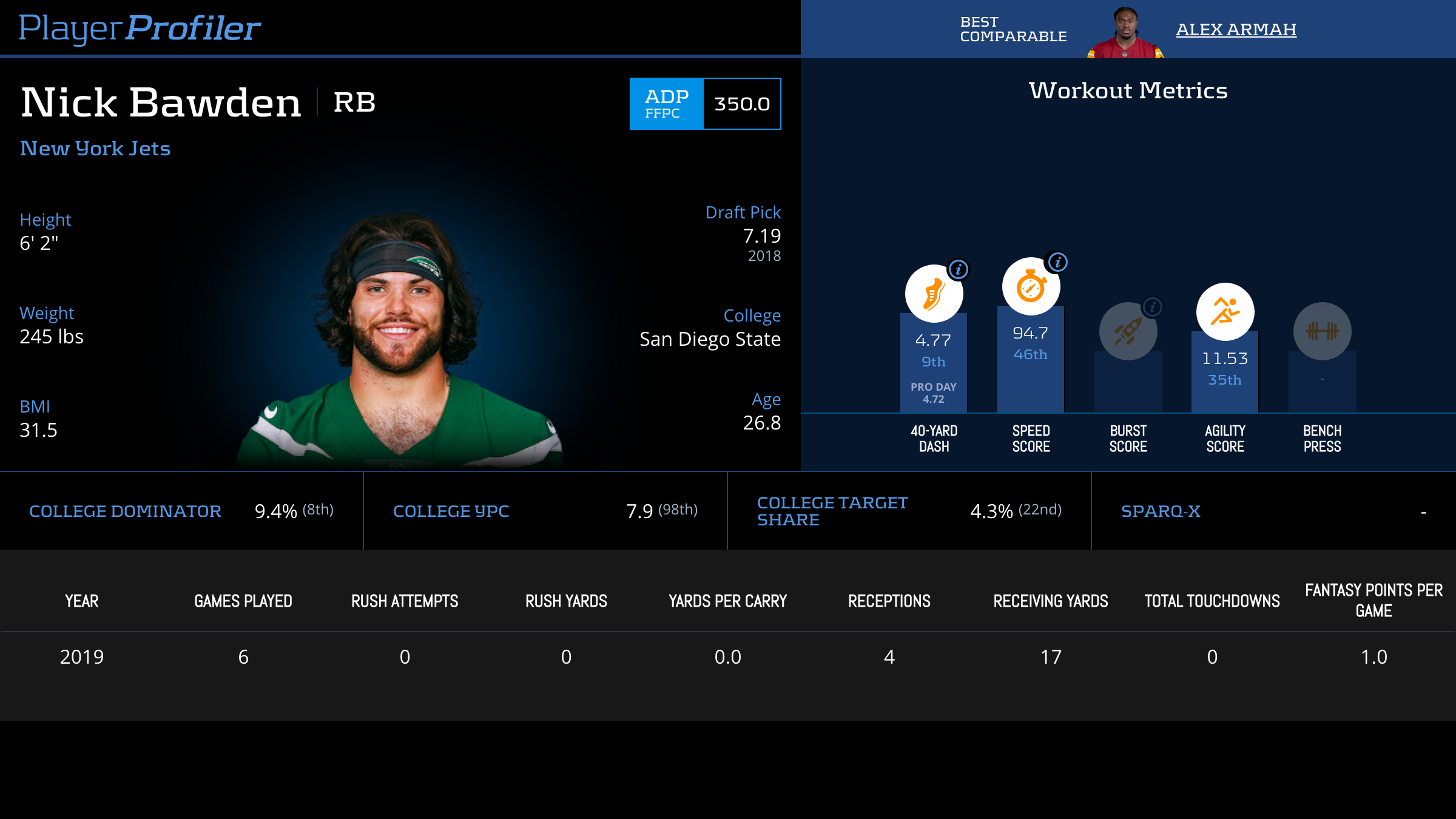 Box score statistics such as targets, yards, touchdowns, and fantasy points per target are updated the next day. Advanced stats and metrics are updated later in the week during the NFL season.