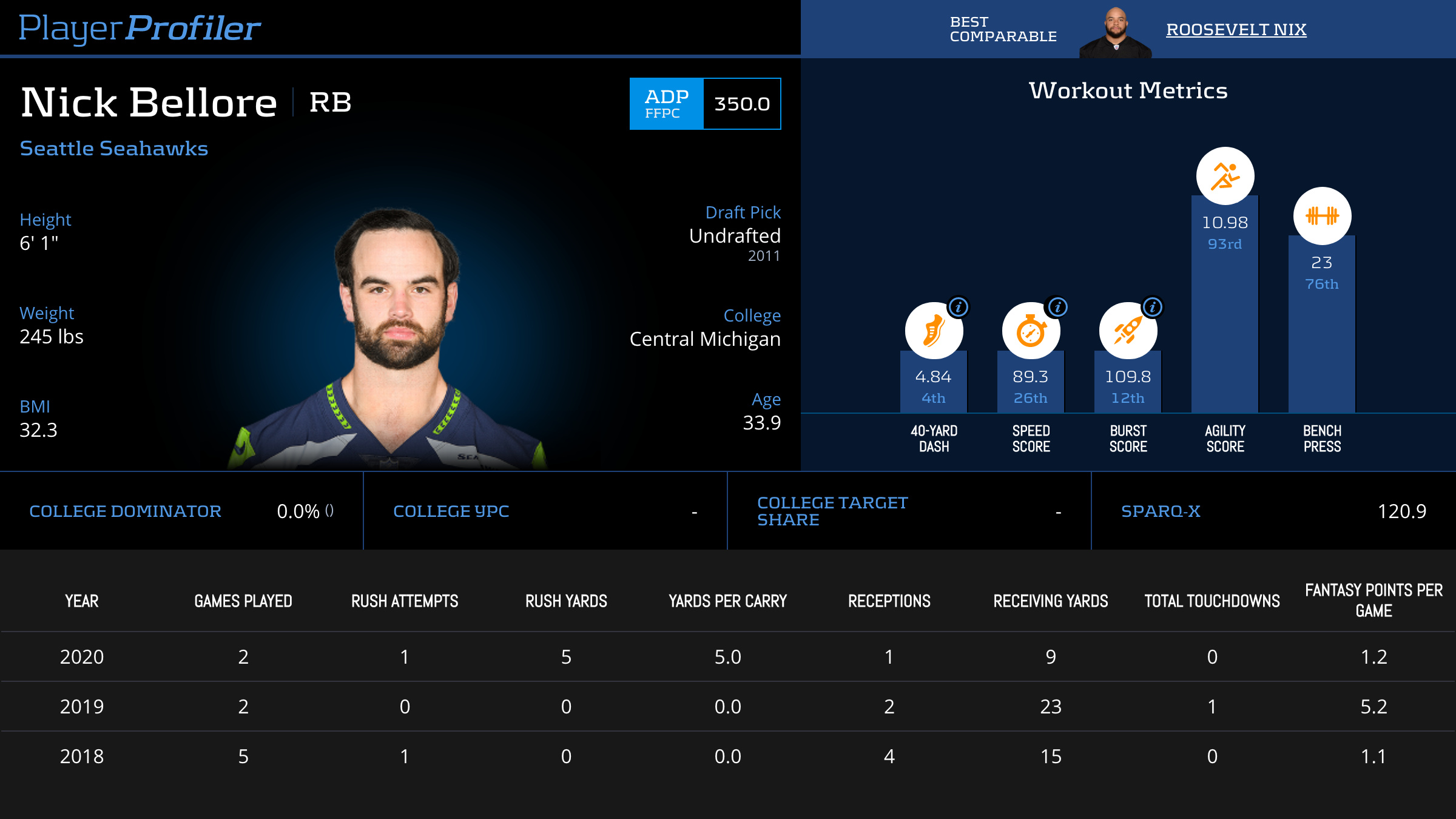 Box score statistics such as targets, yards, touchdowns, and fantasy points per target are updated the next day. Advanced stats and metrics are updated later in the week during the NFL season.