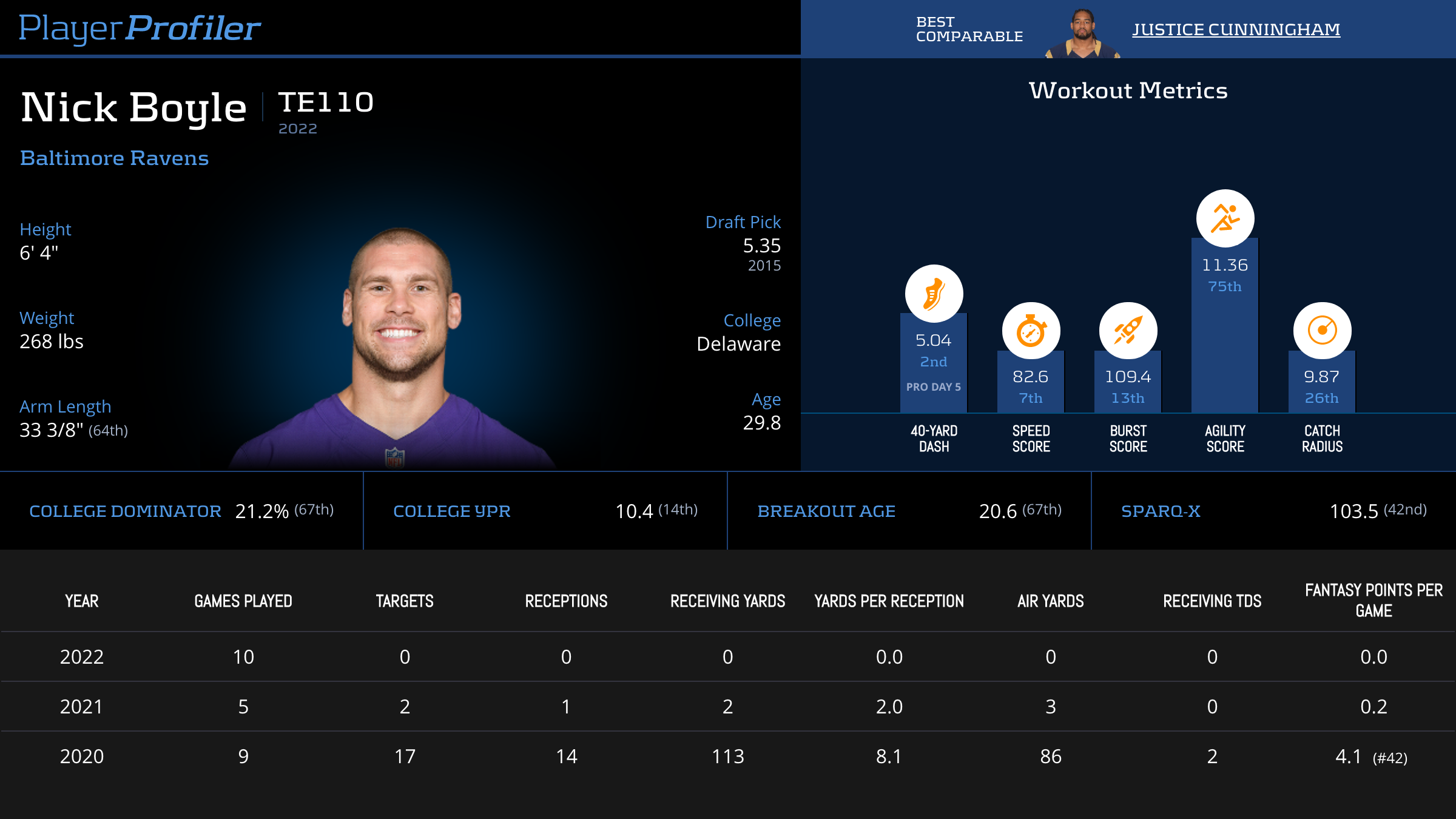 | Year Year | Games Games | Receptions Recs | Receiving Yards Rec Yds | Target Share Tgt Share | Catch Rate Catch Rate | Receiving Touchdowns Rec TDs | Special Teams Yards Special Teams | Age Age | School School |