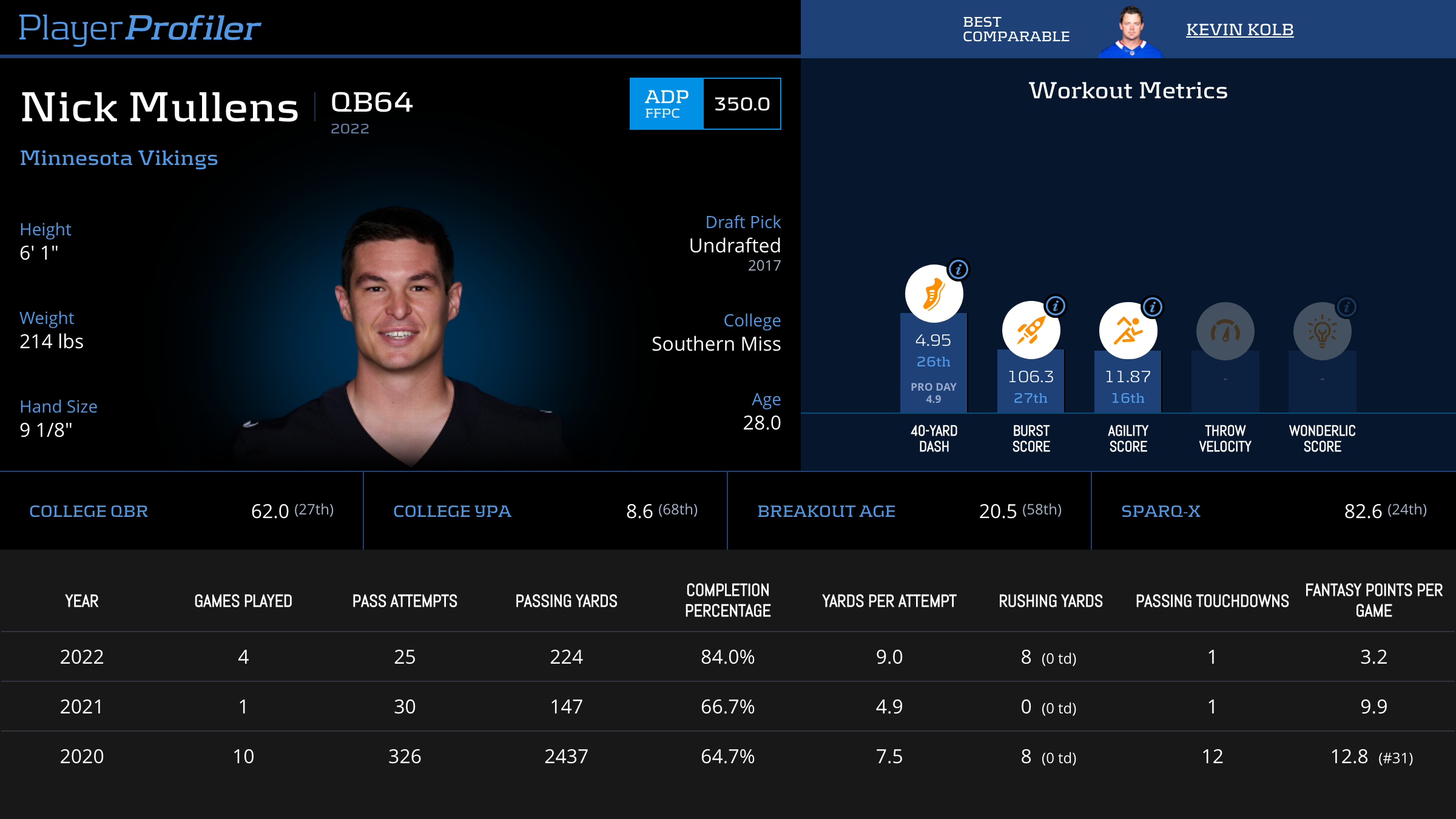 | Year Year | Games Games | Pass Attempts Pass Atts | Passing Yards Pass Yds | Yards Per Attempt YPA | Completion Percentage Comp % | Passing Touchdowns Pass TDs | Rushing Yards Rush Yds | Age Age | School School |