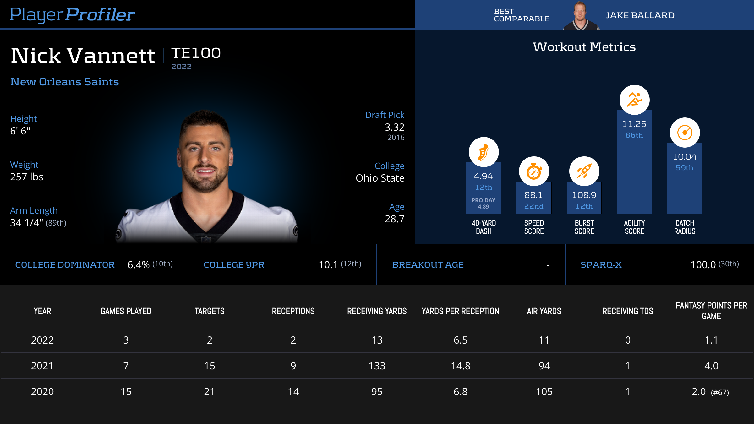 Box score statistics such as targets, yards, touchdowns, and fantasy points per target are updated the next day. Advanced stats and metrics are updated later in the week during the NFL season.