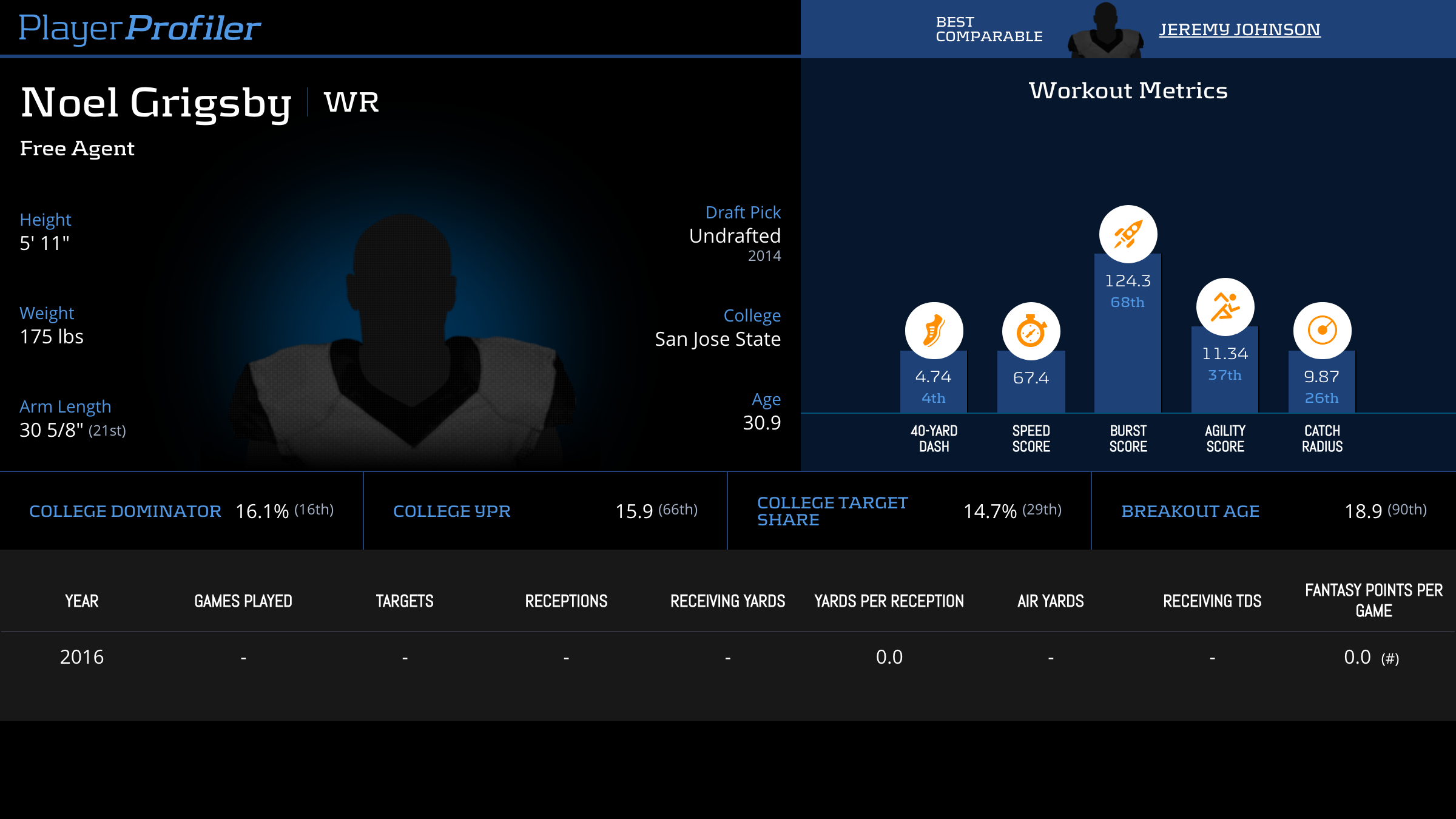 | Year Year | Games Games | Receptions Recs | Receiving Yards Rec Yds | Target Share Tgt Share | Catch Rate Catch Rate | Receiving Touchdowns Rec TDs | Special Teams Yards Special Teams | Age Age | School School |