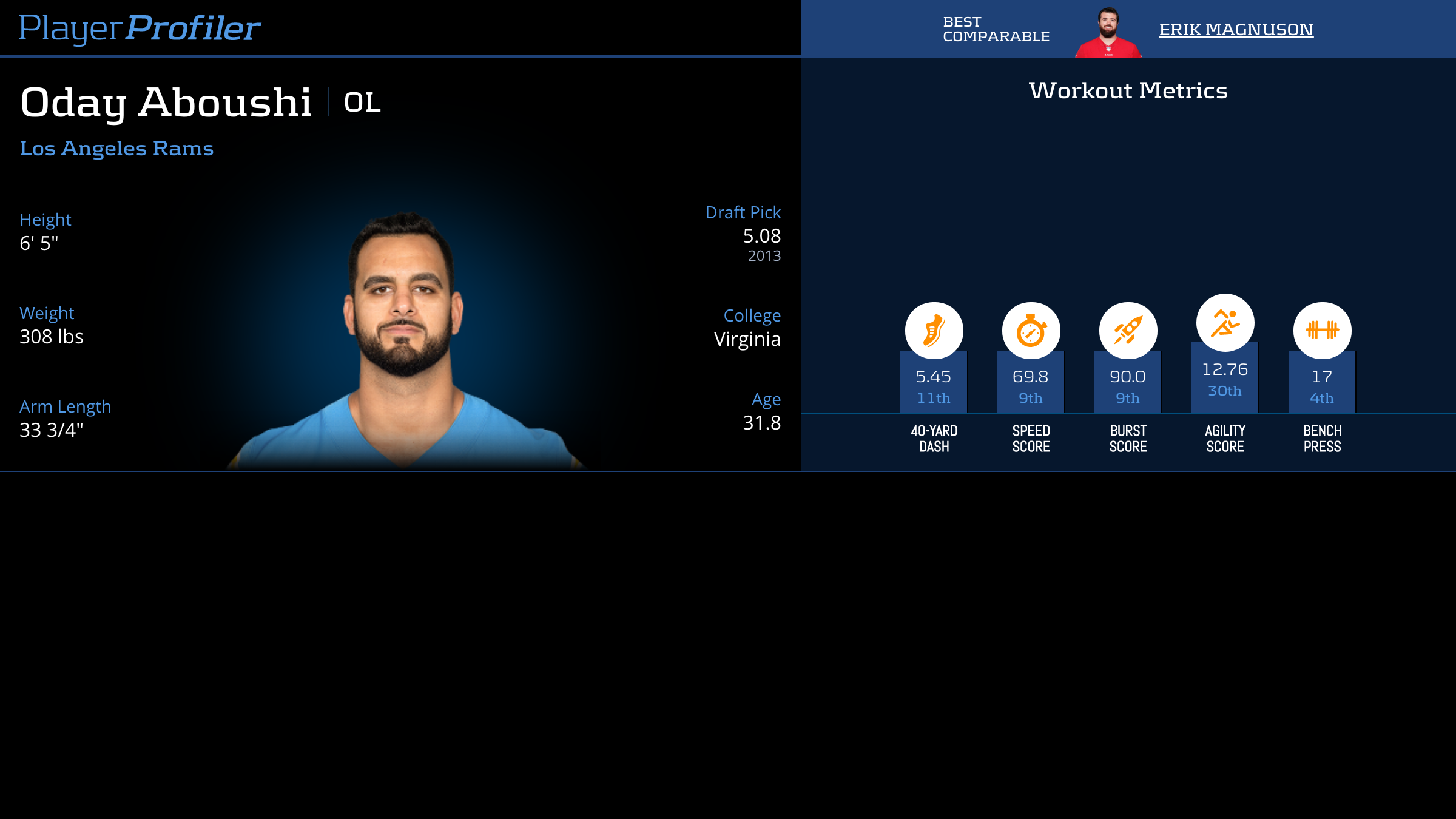 Download all Oday Aboushi advanced stats and metrics with Data Analysis.