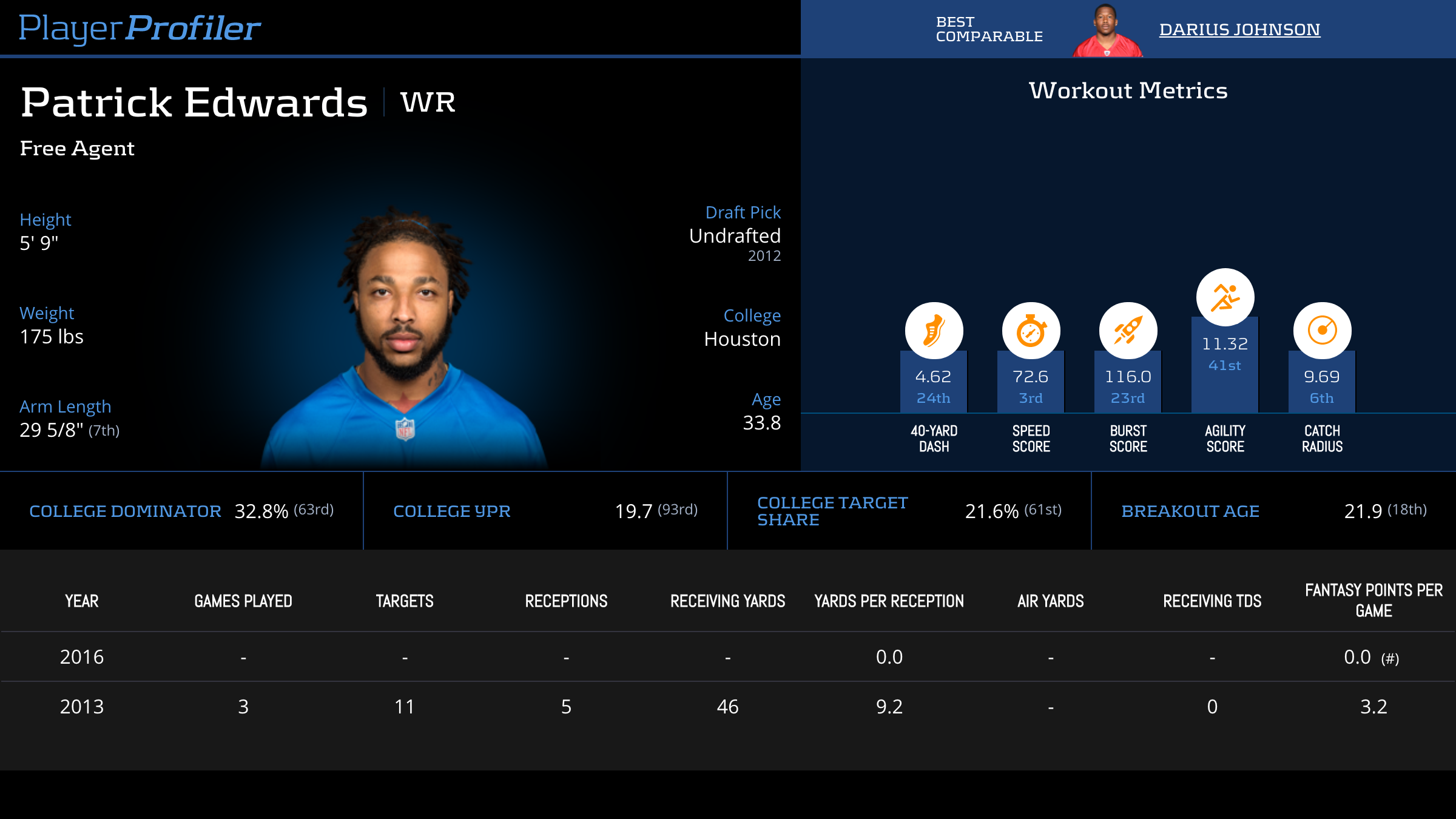 Box score statistics such as targets, yards, touchdowns, and fantasy points per target are updated the next day. Advanced stats and metrics are updated later in the week during the NFL season.