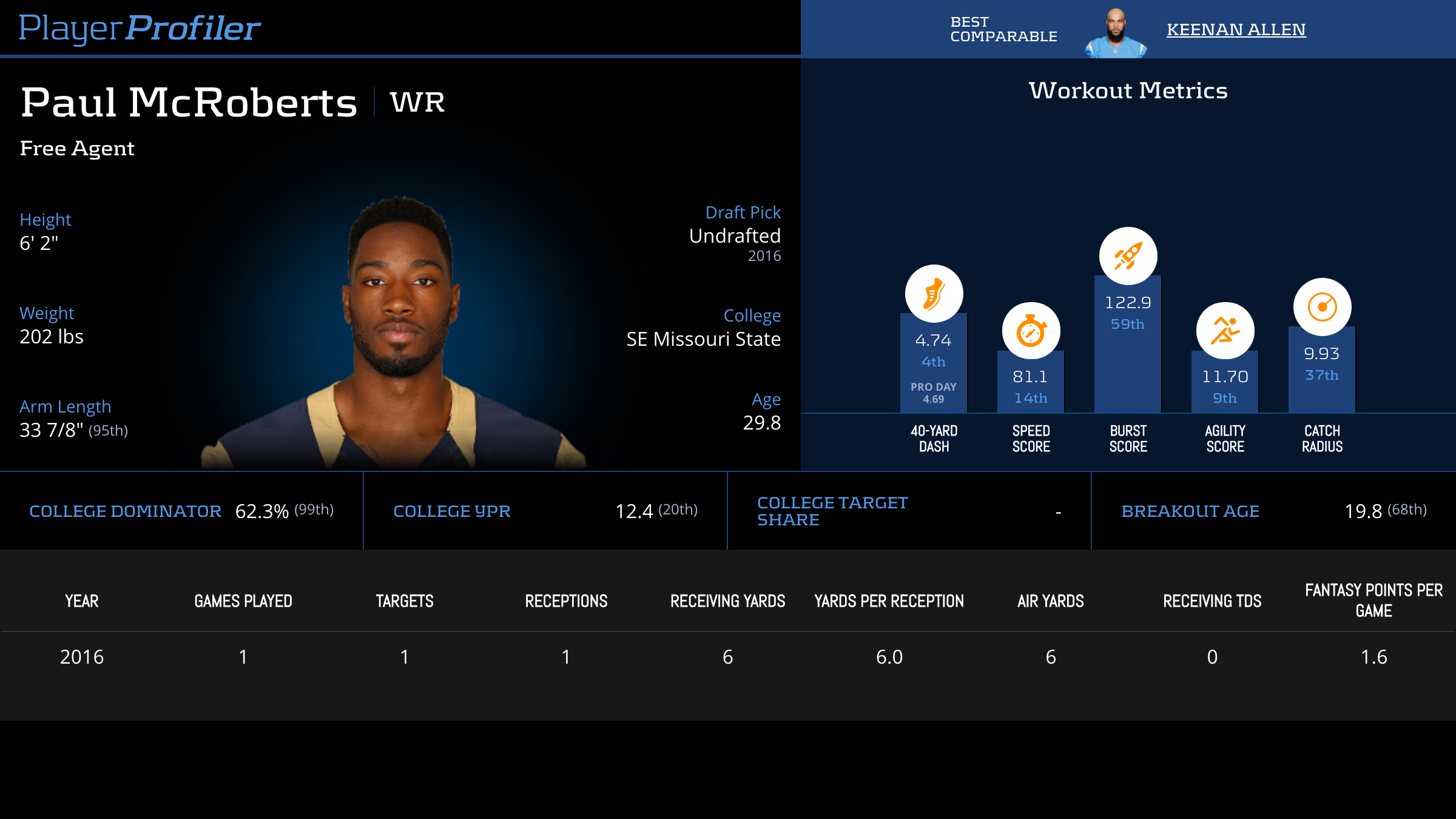 Box score statistics such as targets, yards, touchdowns, and fantasy points per target are updated the next day. Advanced stats and metrics are updated later in the week during the NFL season.