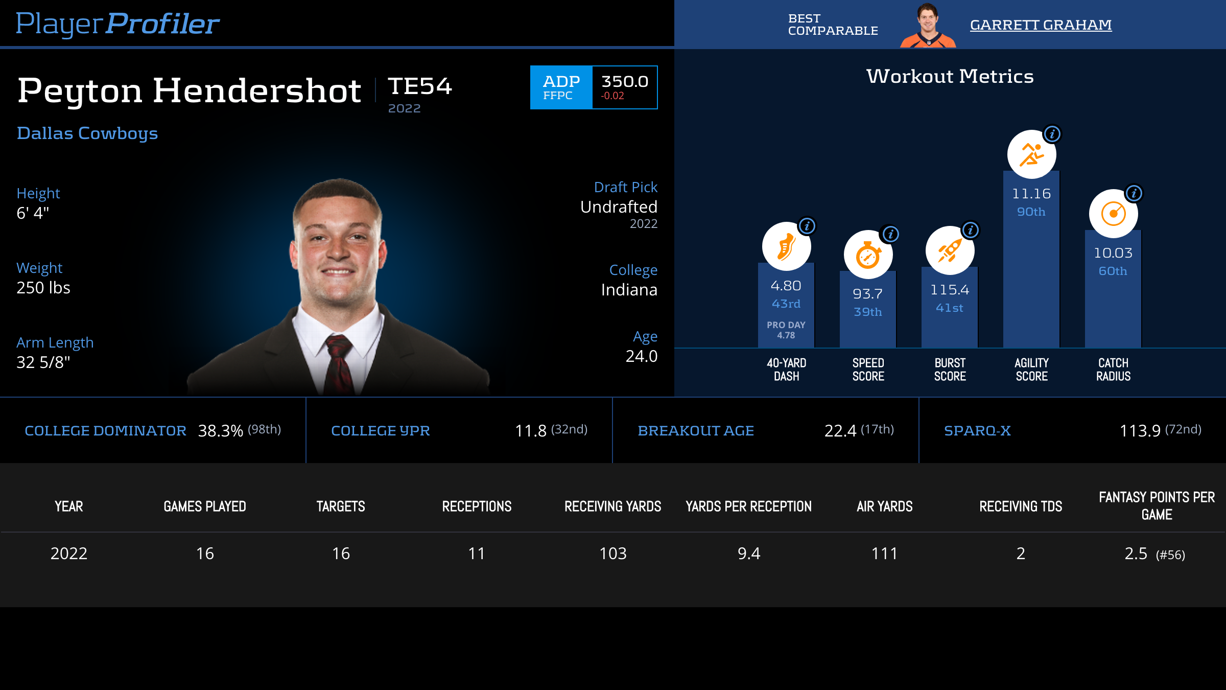 | Year Year | Games Games | Receptions Recs | Receiving Yards Rec Yds | Target Share Tgt Share | Catch Rate Catch Rate | Receiving Touchdowns Rec TDs | Special Teams Yards Special Teams | Age Age | School School |