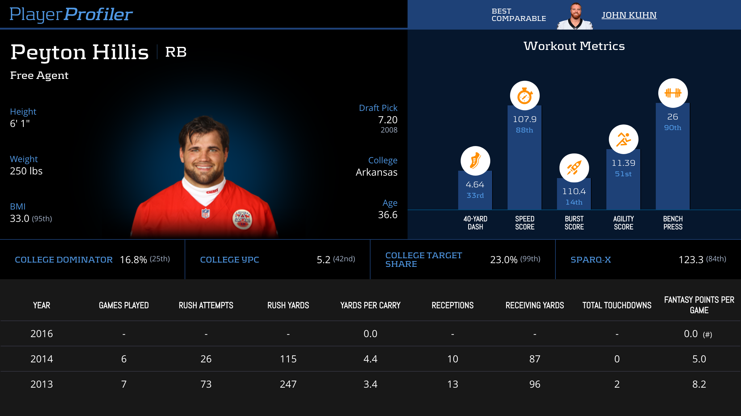 | Year Year | Games Games | Rush Attempts Rush Atts | Rushing Yards Rush Yrds | Total Touchdowns TDs | Receptions Rec | Receiving Yards Rec Yrds | Target Share Tgt Share | Age Age | School School |