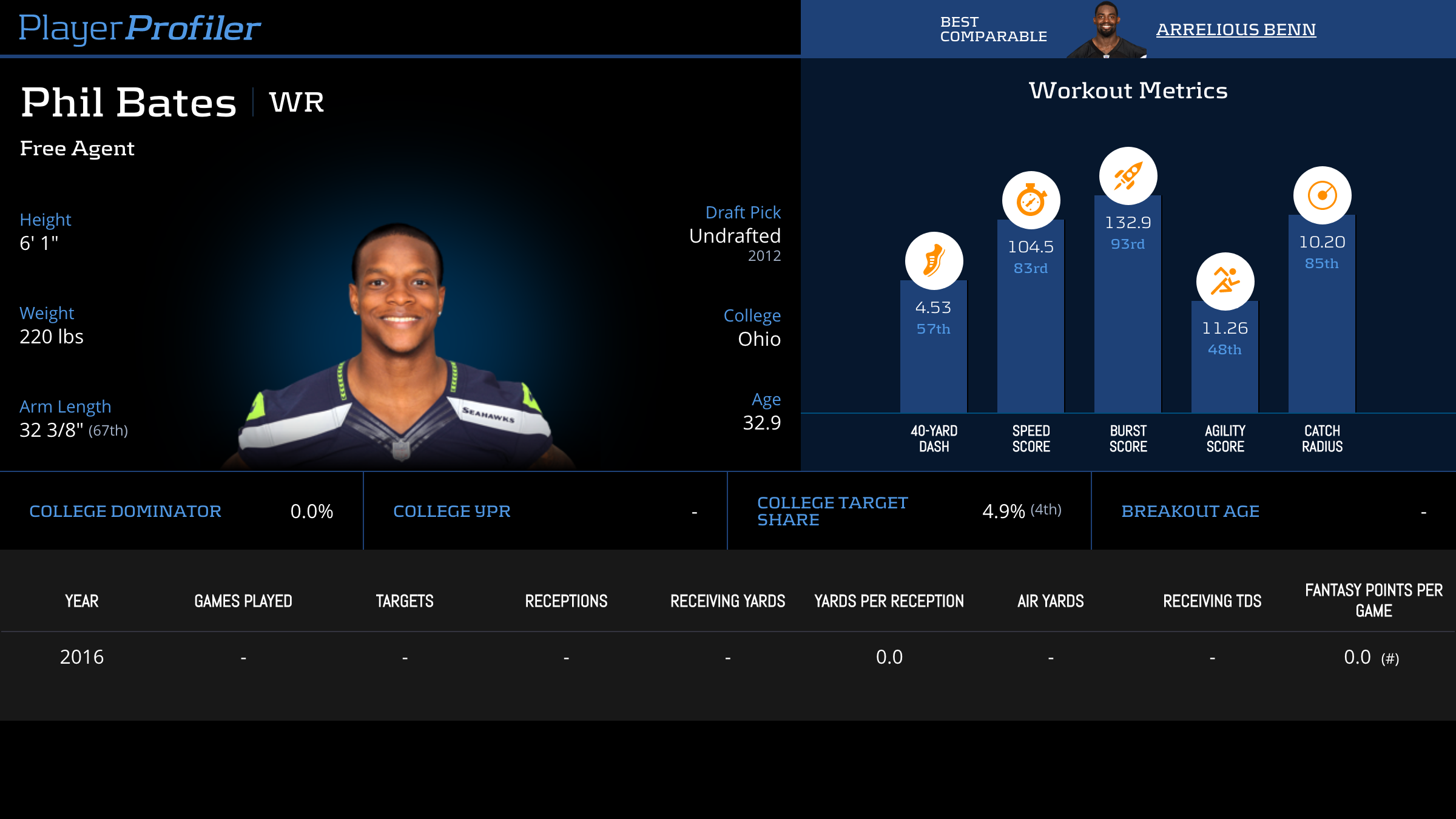 | Year Year | Games Games | Receptions Recs | Receiving Yards Rec Yds | Target Share Tgt Share | Catch Rate Catch Rate | Receiving Touchdowns Rec TDs | Special Teams Yards Special Teams | Age Age | School School |