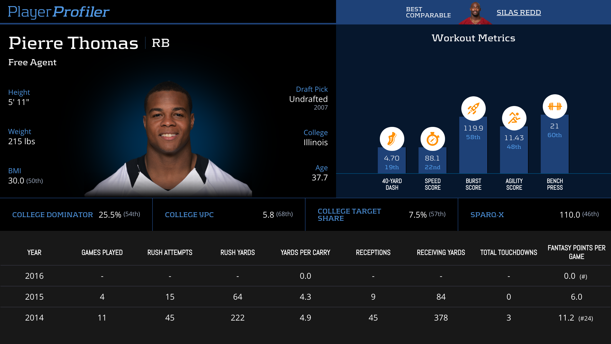 | 14 | CHI | 56.2% | -- | -- | 1 tgts | 1 | 12 | -- | 2.2 |