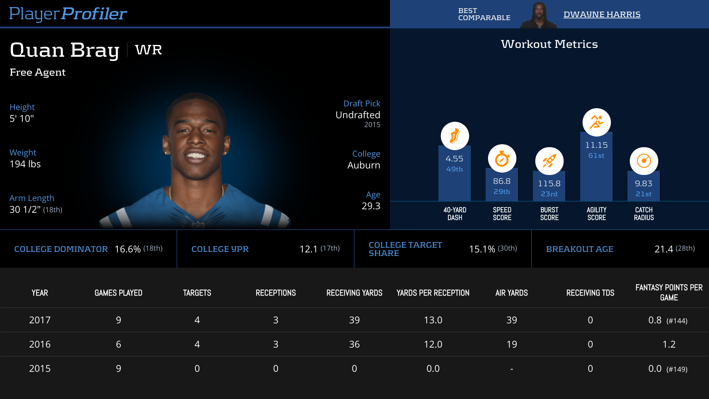 | Year Year | Games Games | Receptions Recs | Receiving Yards Rec Yds | Target Share Tgt Share | Catch Rate Catch Rate | Receiving Touchdowns Rec TDs | Special Teams Yards Special Teams | Age Age | School School |
