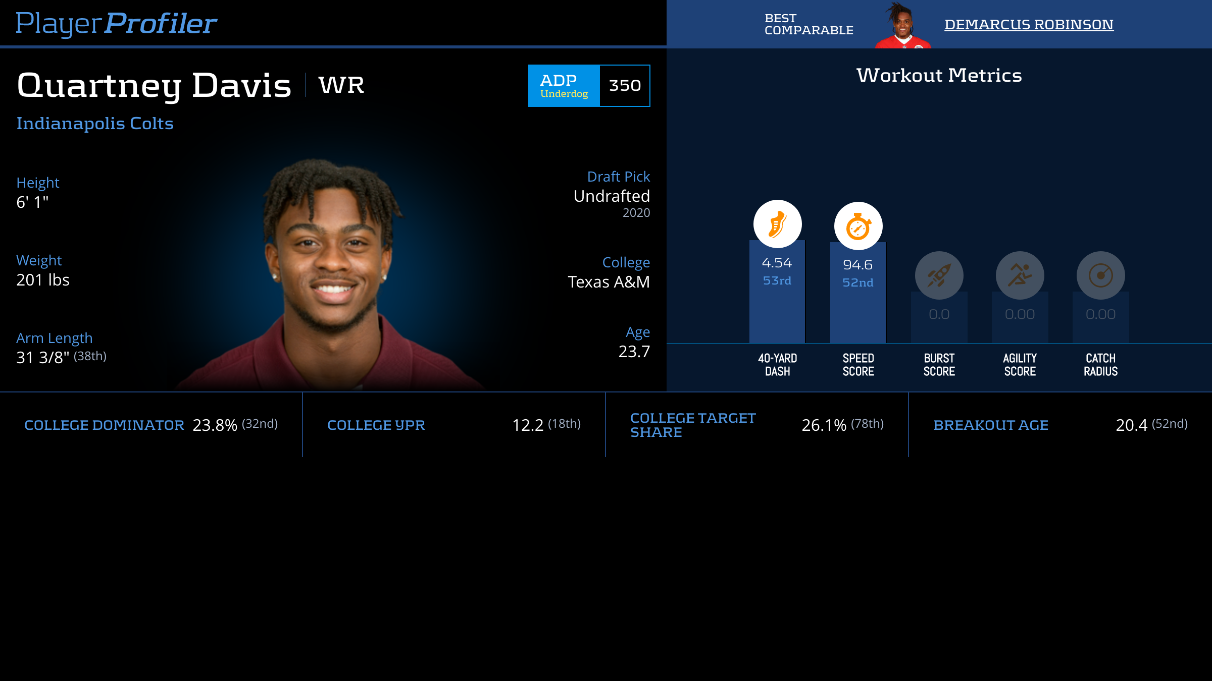 | Year Year | Games Games | Receptions Recs | Receiving Yards Rec Yds | Target Share Tgt Share | Catch Rate Catch Rate | Receiving Touchdowns Rec TDs | Special Teams Yards Special Teams | Age Age | School School |