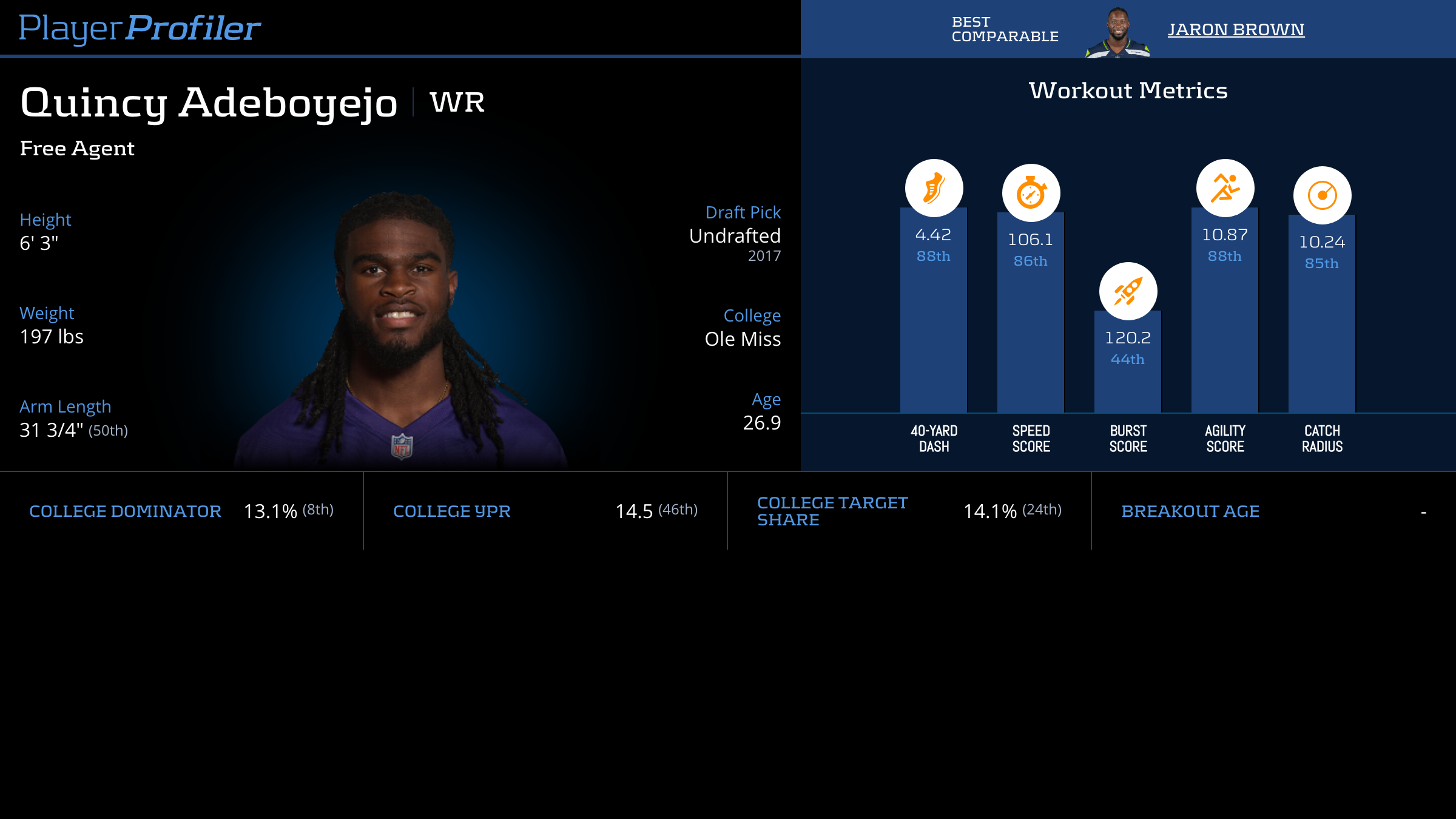 | Year Year | Games Games | Receptions Recs | Receiving Yards Rec Yds | Target Share Tgt Share | Catch Rate Catch Rate | Receiving Touchdowns Rec TDs | Special Teams Yards Special Teams | Age Age | School School |