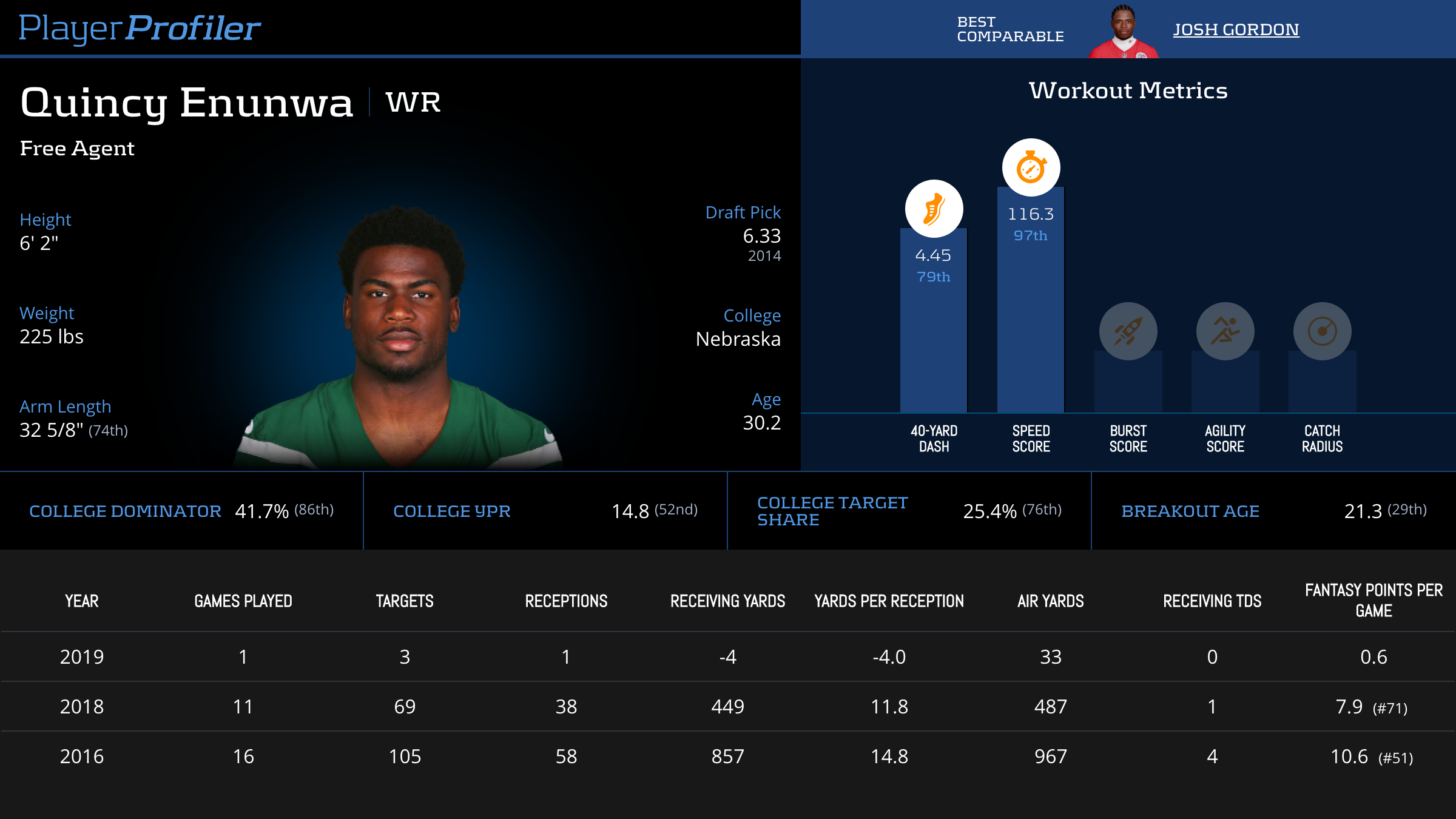 Box score statistics such as targets, yards, touchdowns, and fantasy points per target are updated the next day. Advanced stats and metrics are updated later in the week during the NFL season.