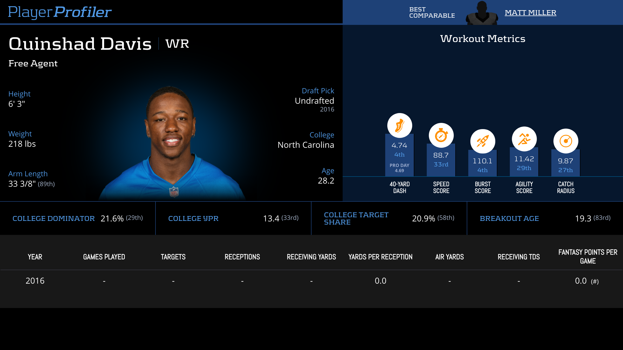 | Year Year | Games Games | Receptions Recs | Receiving Yards Rec Yds | Target Share Tgt Share | Catch Rate Catch Rate | Receiving Touchdowns Rec TDs | Special Teams Yards Special Teams | Age Age | School School |