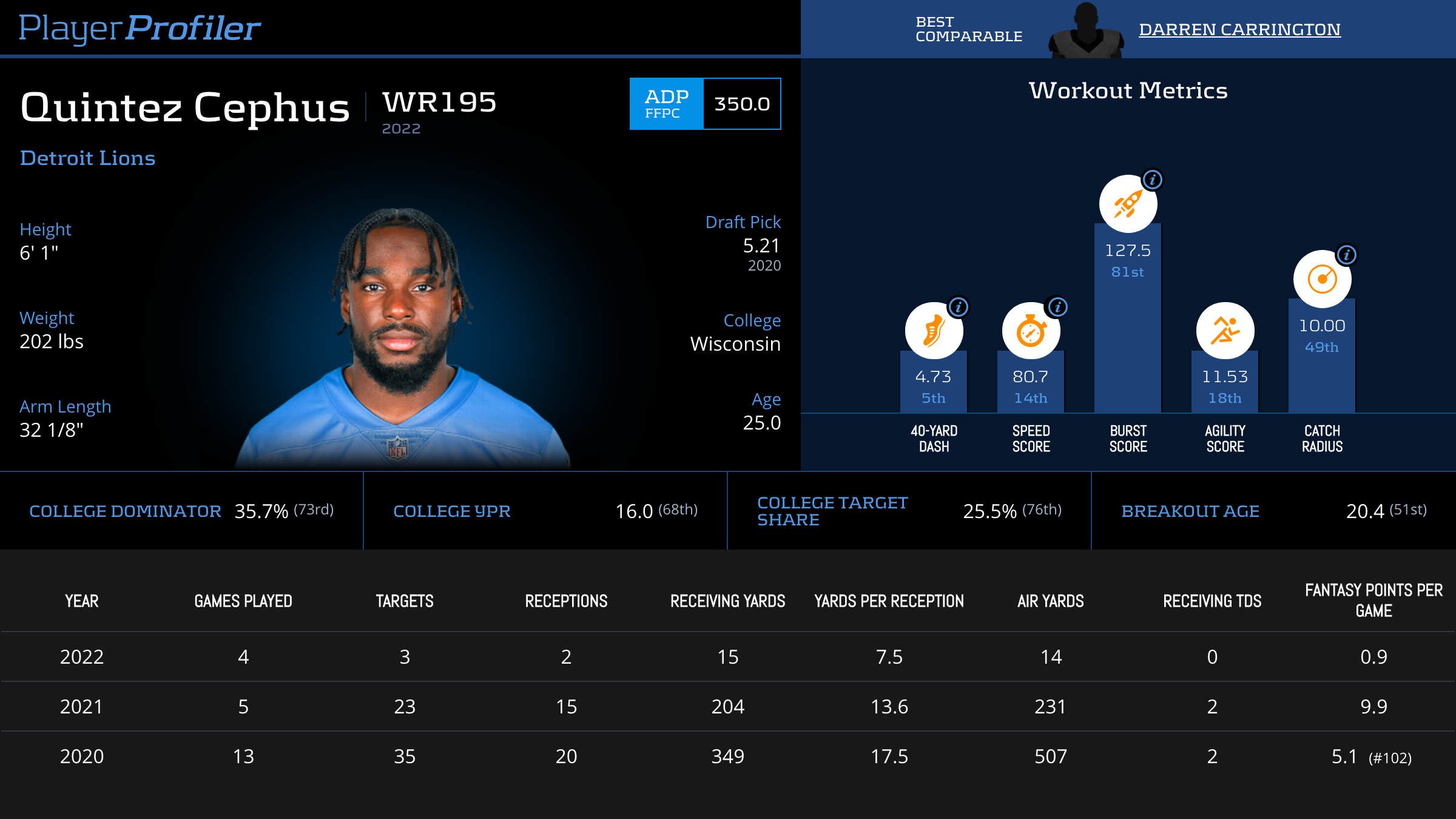 | 3 | MIN | Patrick Peterson | 7.9% | 1 (2.4% rate) | -- | -- | -- | 0.0 (#115) |