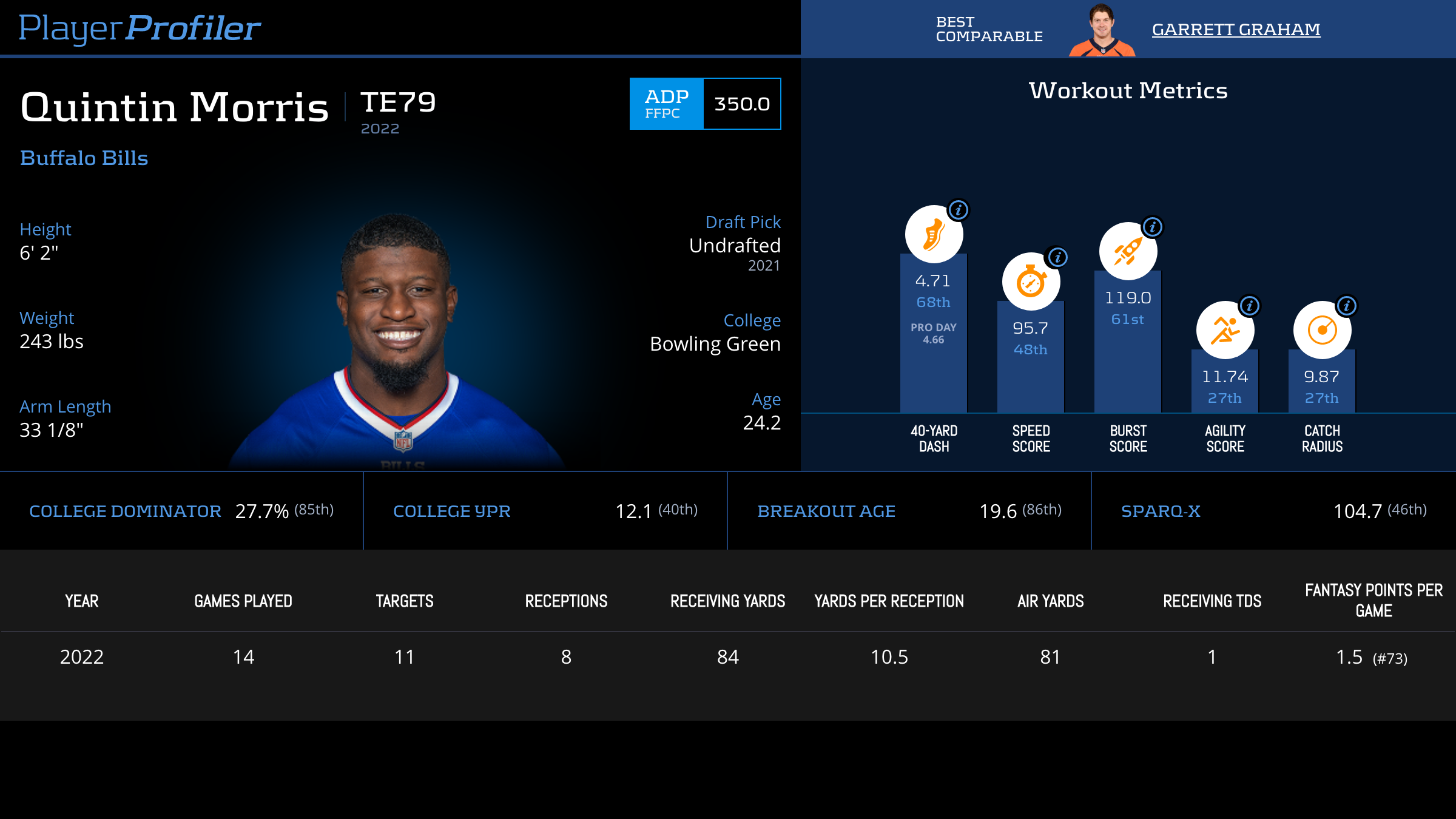 Box score statistics such as targets, yards, touchdowns, and fantasy points per target are updated the next day. Advanced stats and metrics are updated later in the week during the NFL season.