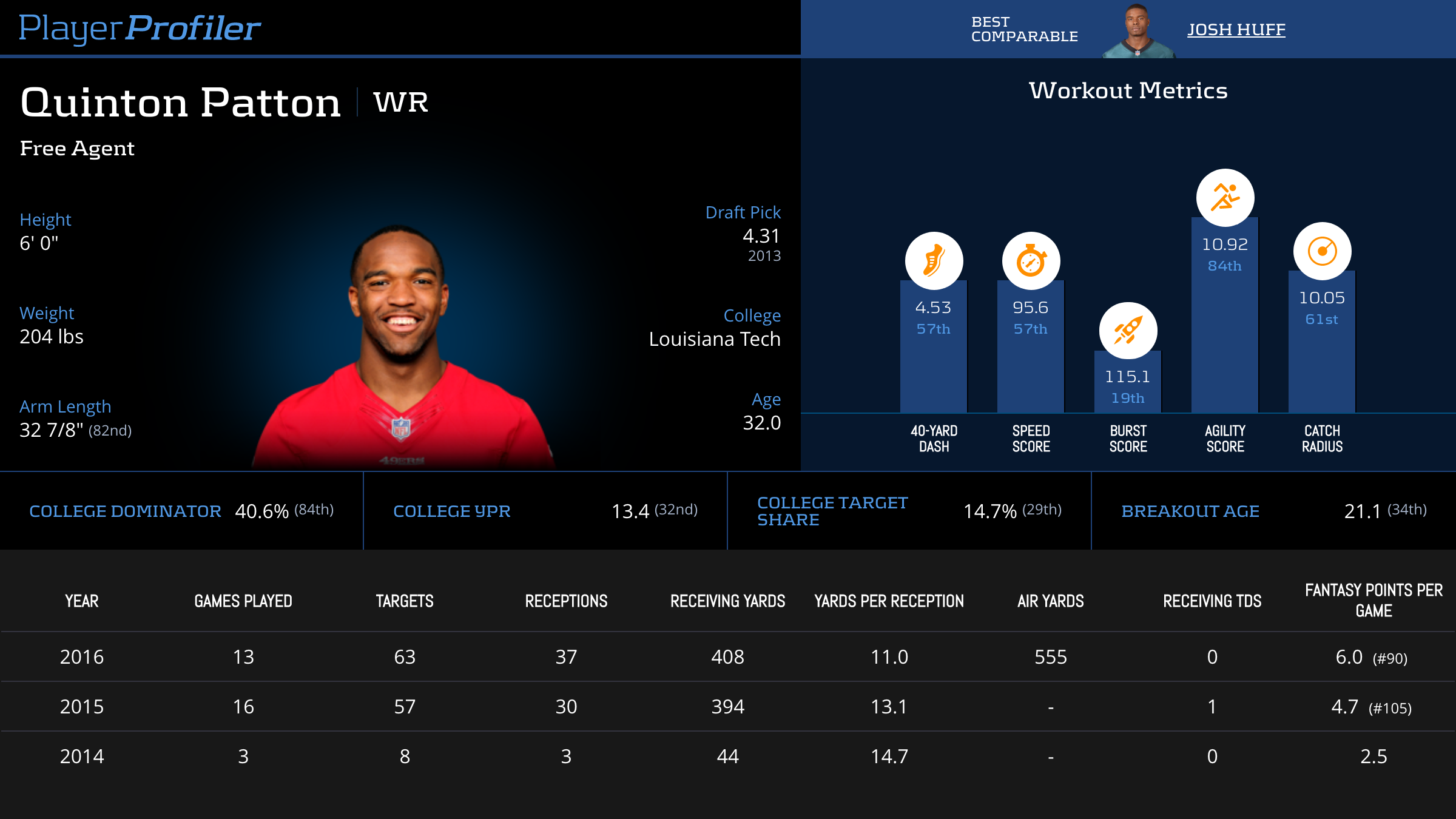| Year Year | Games Games | Receptions Recs | Receiving Yards Rec Yds | Target Share Tgt Share | Catch Rate Catch Rate | Receiving Touchdowns Rec TDs | Special Teams Yards Special Teams | Age Age | School School |