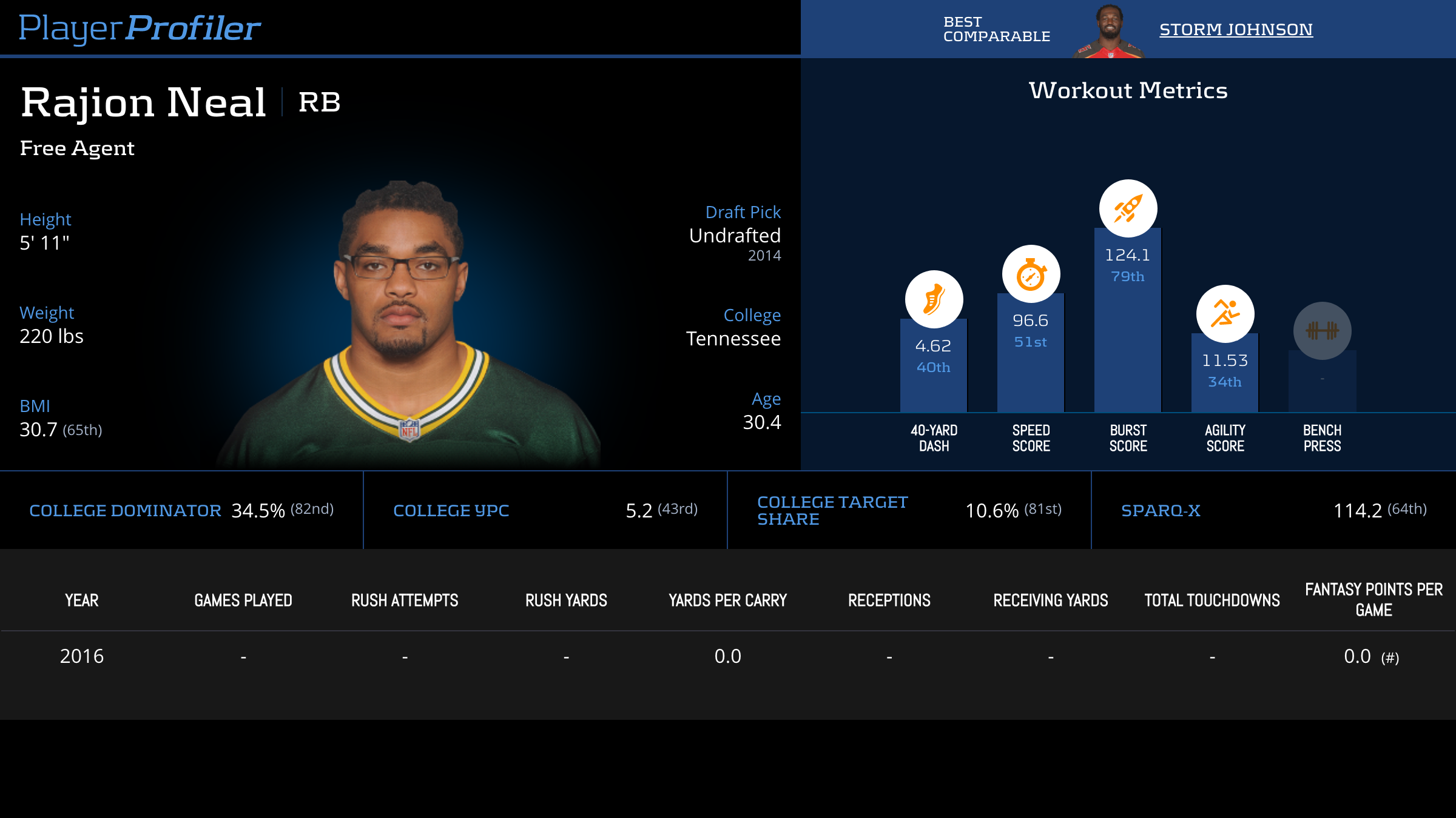 | Year Year | Games Games | Rush Attempts Rush Atts | Rushing Yards Rush Yrds | Total Touchdowns TDs | Receptions Rec | Receiving Yards Rec Yrds | Target Share Tgt Share | Age Age | School School |
