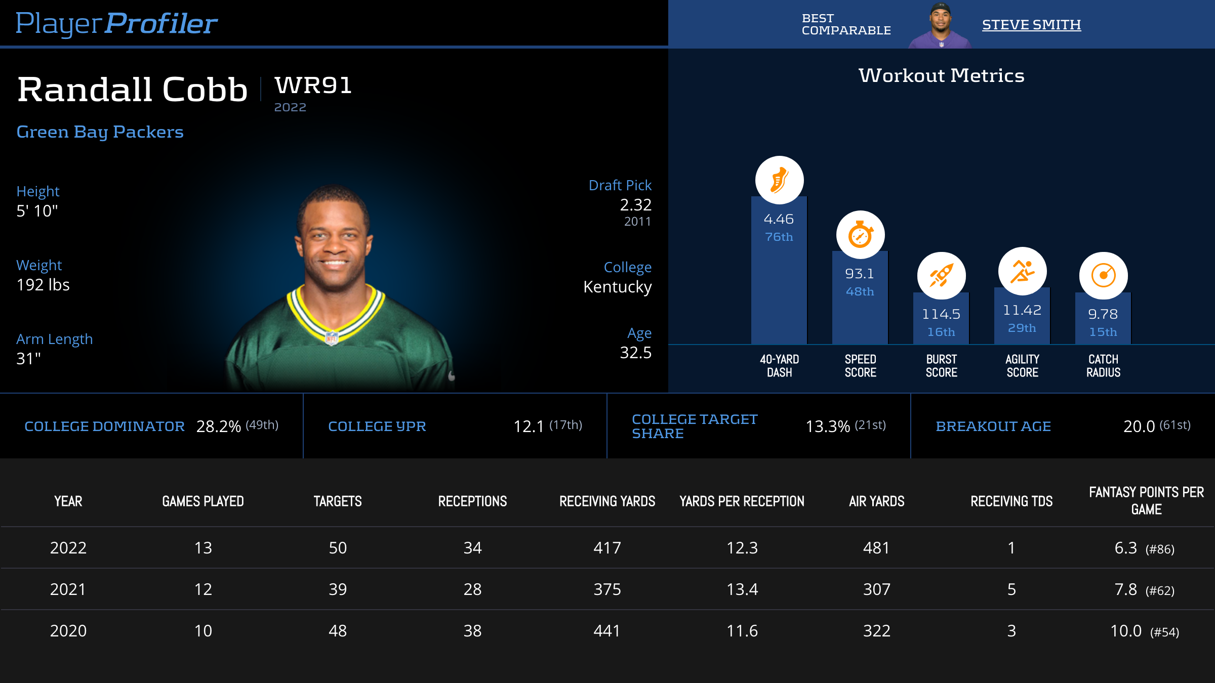 | 14 | HOU | Jimmie Ward | 19.4% | 4 (10.0% rate) | 1 (1 rz) | 1 (1 tds) | 15 (6 air) | 8.5 (#40) |