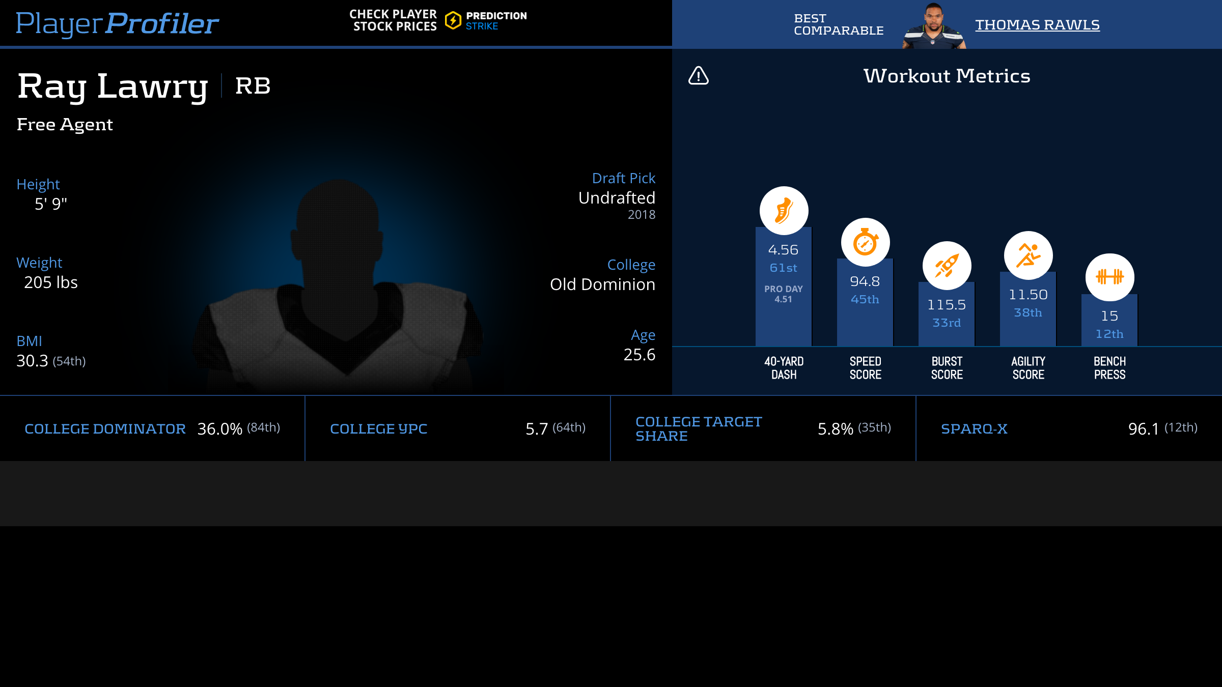 | Year Year | Games Games | Rush Attempts Rush Atts | Rushing Yards Rush Yrds | Total Touchdowns TDs | Receptions Rec | Receiving Yards Rec Yrds | Target Share Tgt Share | Age Age | School School |