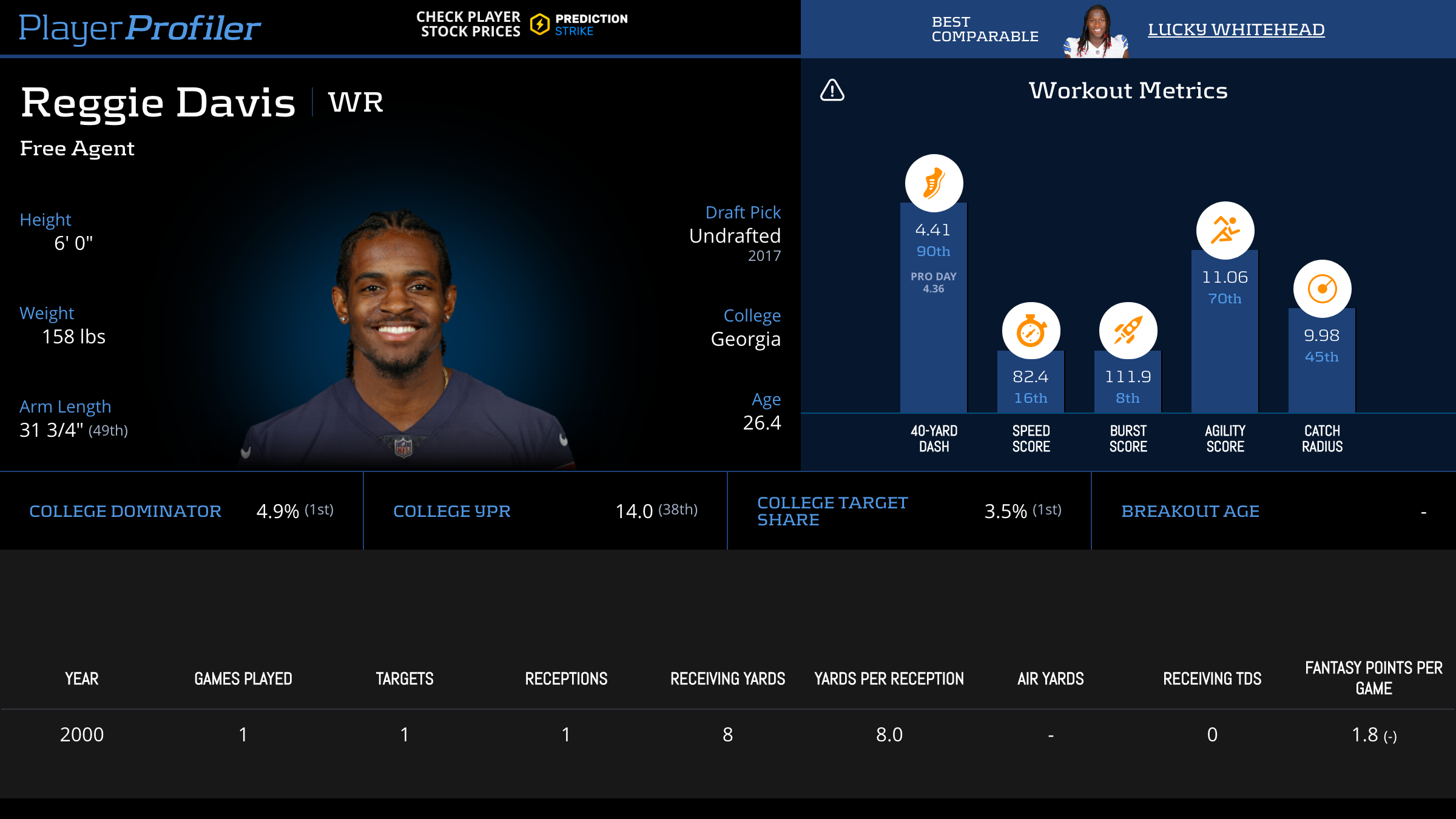 | Year Year | Games Games | Receptions Recs | Receiving Yards Rec Yds | Target Share Tgt Share | Catch Rate Catch Rate | Receiving Touchdowns Rec TDs | Special Teams Yards Special Teams | Age Age | School School |