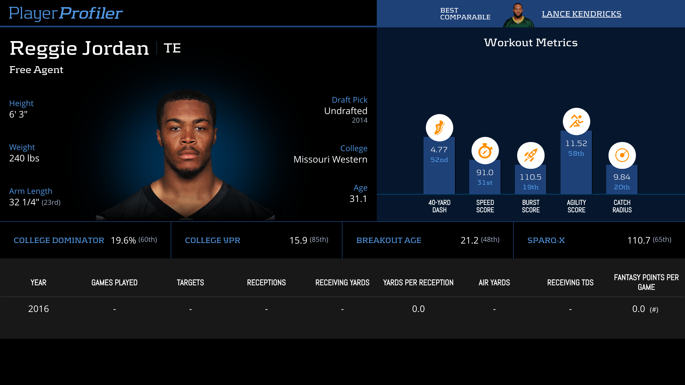 | Year Year | Games Games | Receptions Recs | Receiving Yards Rec Yds | Target Share Tgt Share | Catch Rate Catch Rate | Receiving Touchdowns Rec TDs | Special Teams Yards Special Teams | Age Age | School School |