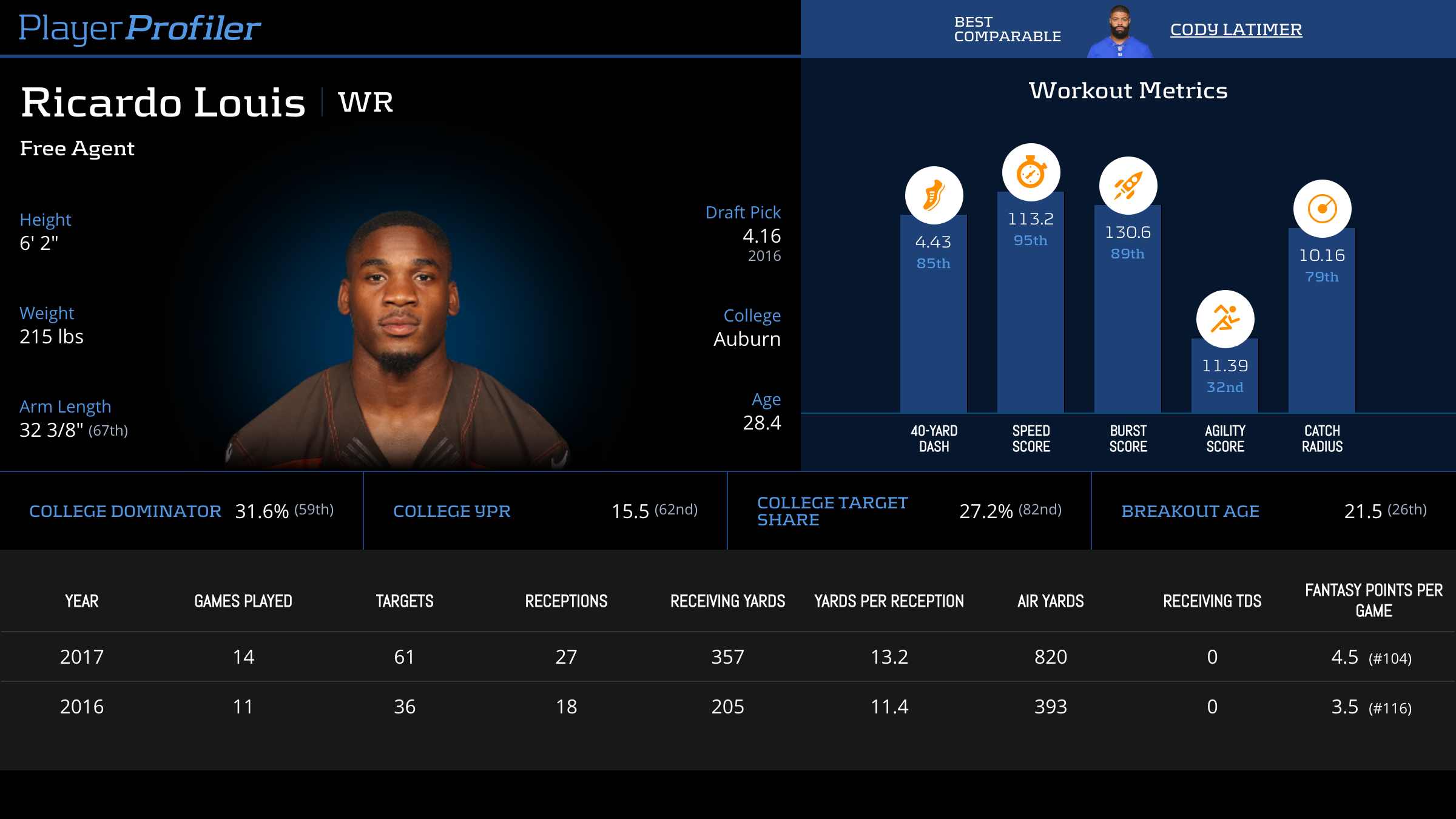 | Year Year | Games Games | Receptions Recs | Receiving Yards Rec Yds | Target Share Tgt Share | Catch Rate Catch Rate | Receiving Touchdowns Rec TDs | Special Teams Yards Special Teams | Age Age | School School |