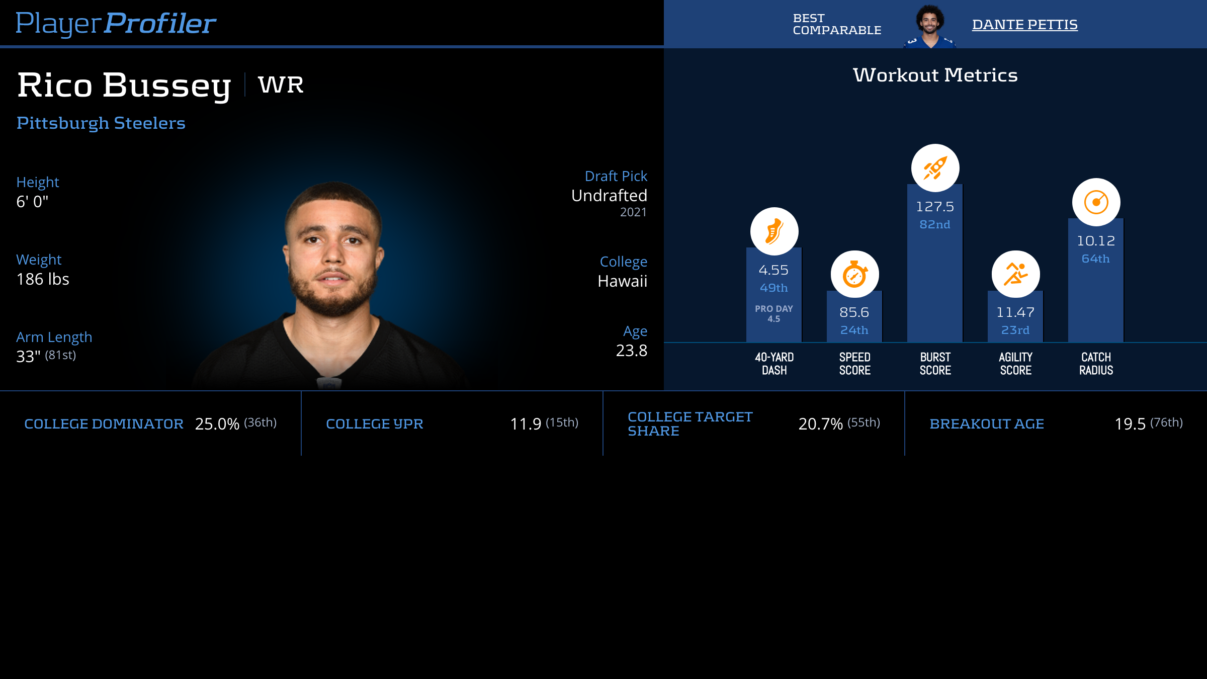 | Year Year | Games Games | Receptions Recs | Receiving Yards Rec Yds | Target Share Tgt Share | Catch Rate Catch Rate | Receiving Touchdowns Rec TDs | Special Teams Yards Special Teams | Age Age | School School |