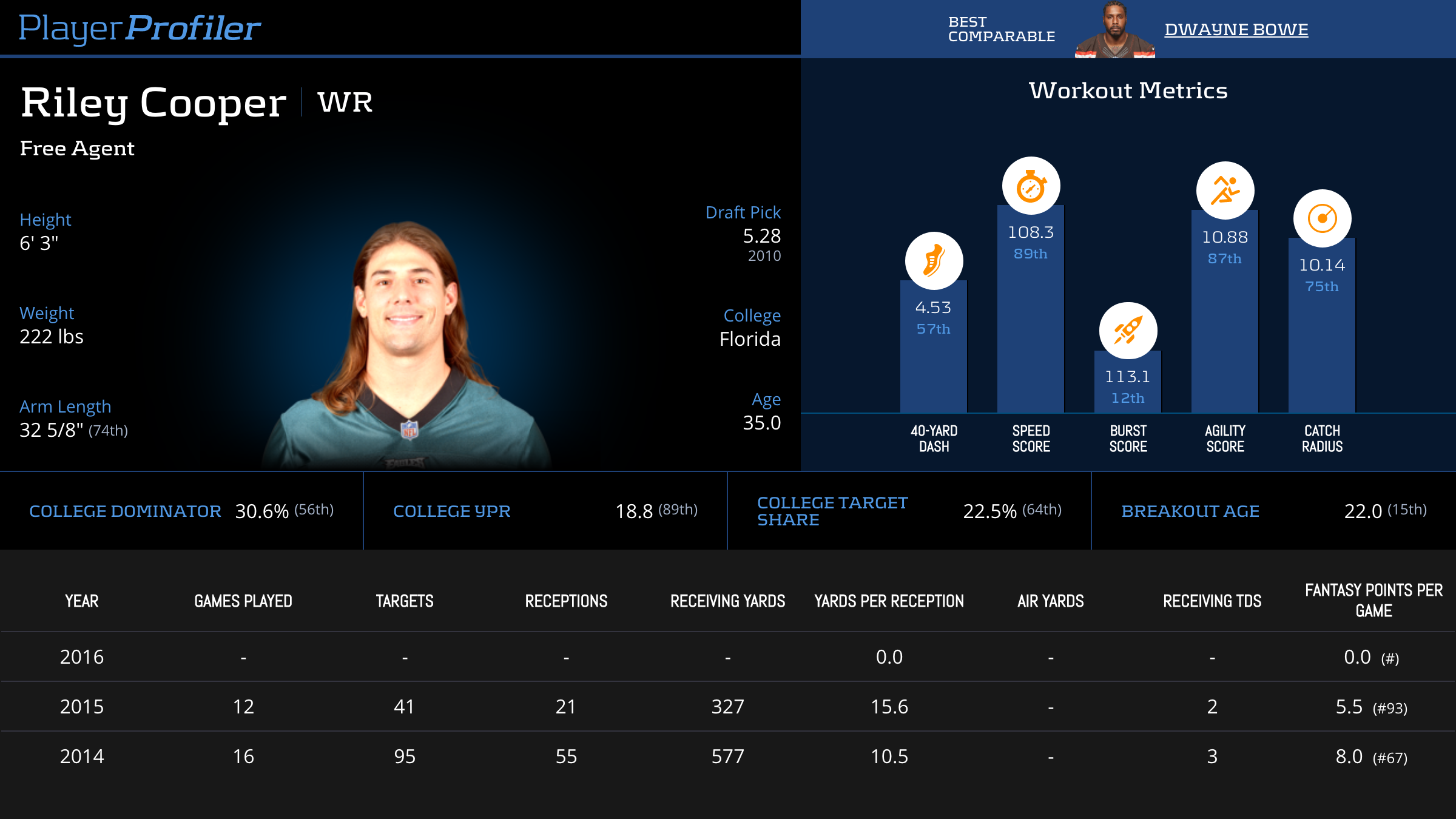 | Year Year | Games Games | Receptions Recs | Receiving Yards Rec Yds | Target Share Tgt Share | Catch Rate Catch Rate | Receiving Touchdowns Rec TDs | Special Teams Yards Special Teams | Age Age | School School |
