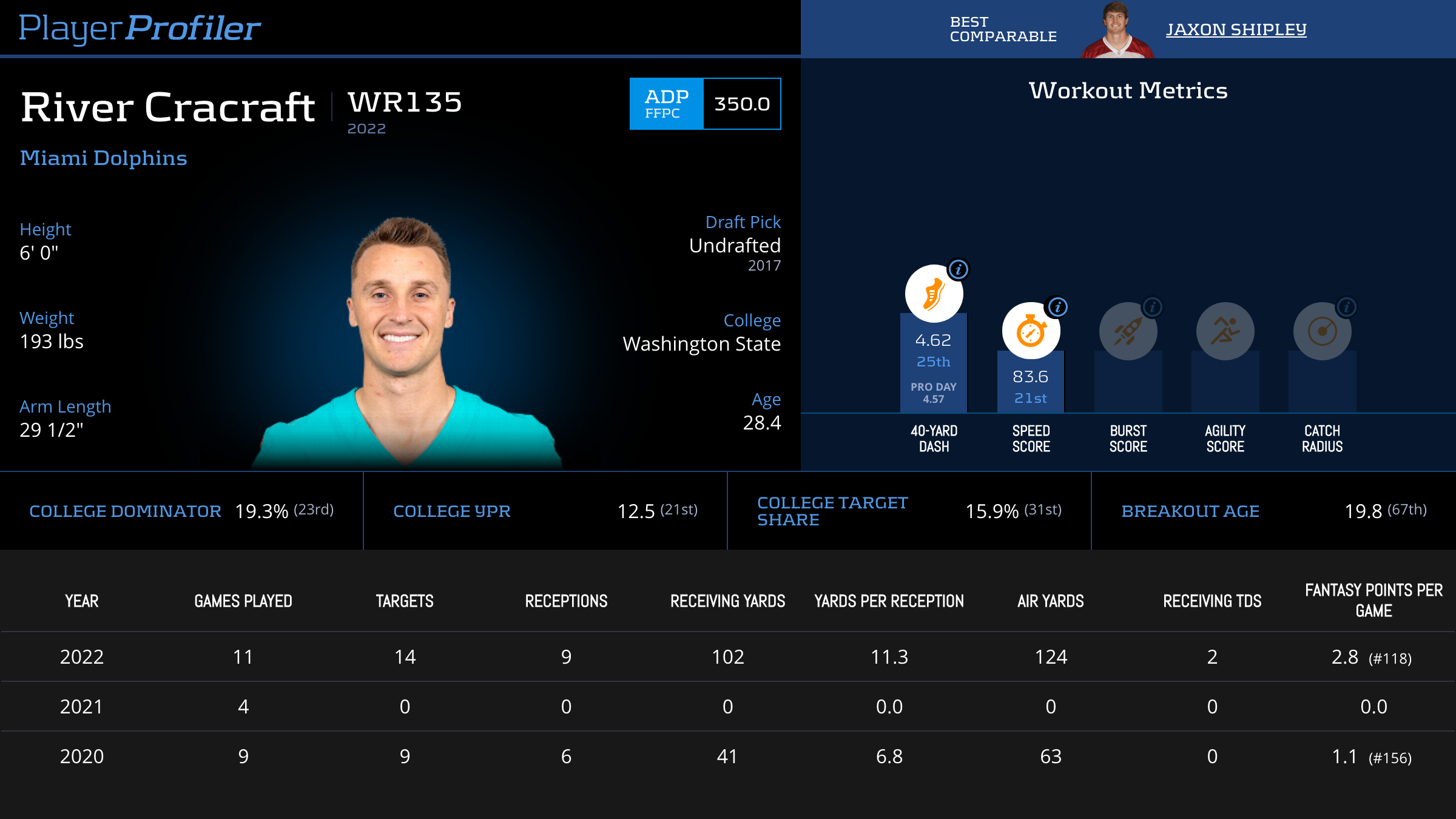 | 18 | NYJ | D.J. Reed | 34.8% | 18 (40.0% rate) | 4 (1 rz) | 4 | 38 (31 air) | 7.8 (#59) |