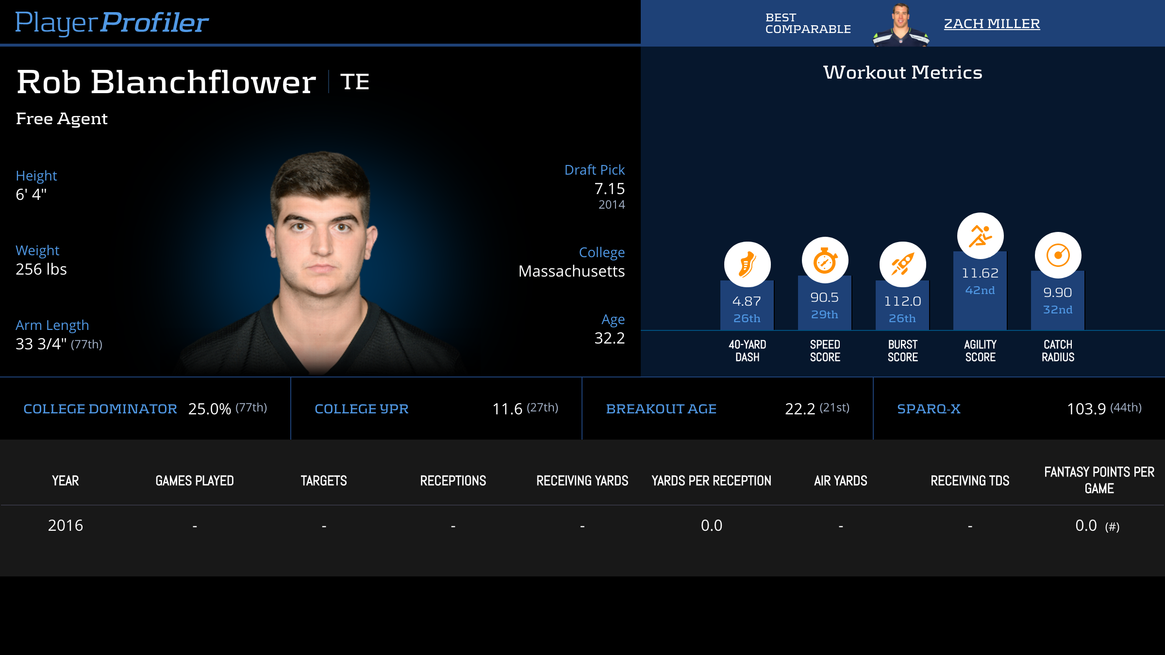 | Year Year | Games Games | Receptions Recs | Receiving Yards Rec Yds | Target Share Tgt Share | Catch Rate Catch Rate | Receiving Touchdowns Rec TDs | Special Teams Yards Special Teams | Age Age | School School |