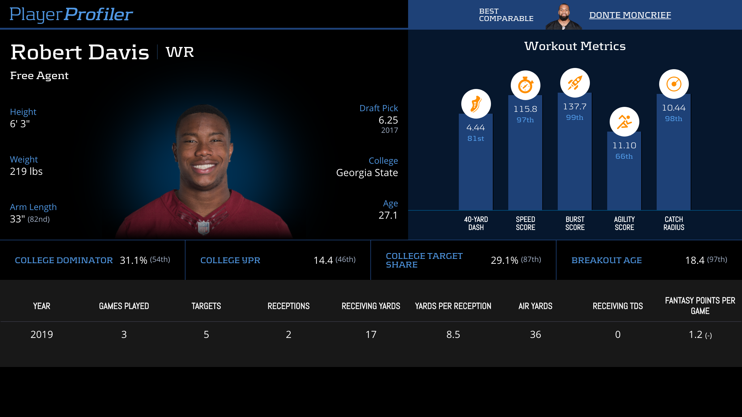 Box score statistics such as targets, yards, touchdowns, and fantasy points per target are updated the next day. Advanced stats and metrics are updated later in the week during the NFL season.
