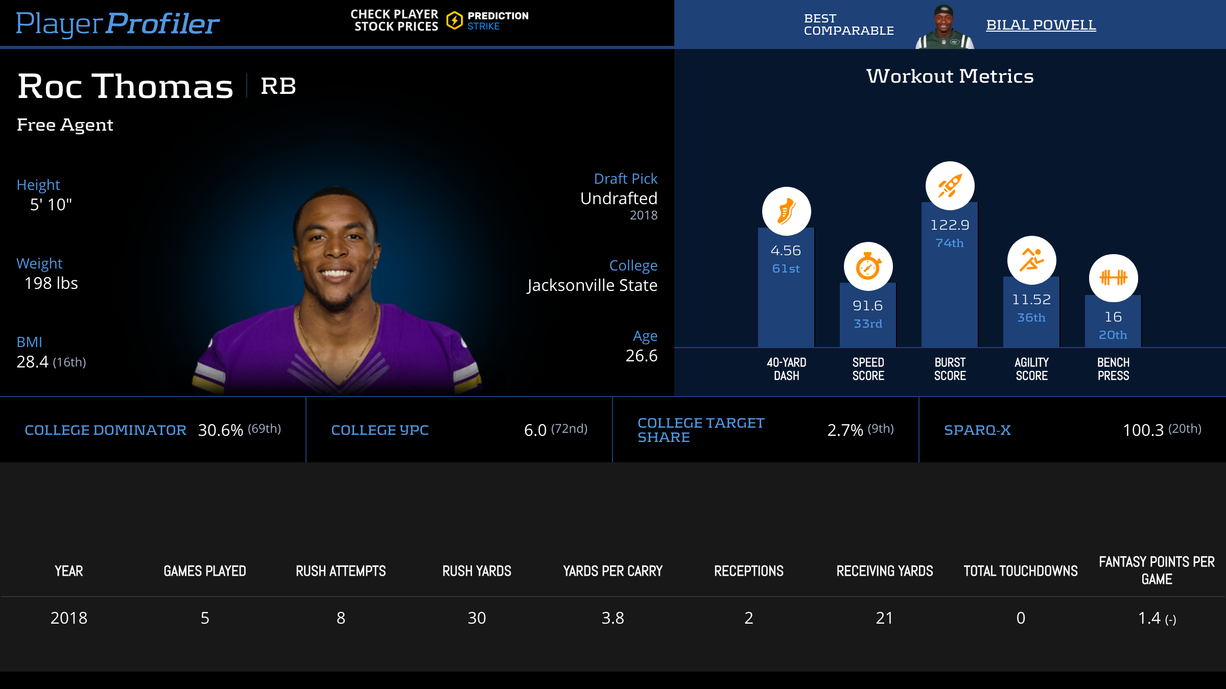 | Year Year | Games Games | Rush Attempts Rush Atts | Rushing Yards Rush Yrds | Total Touchdowns TDs | Receptions Rec | Receiving Yards Rec Yrds | Target Share Tgt Share | Age Age | School School |