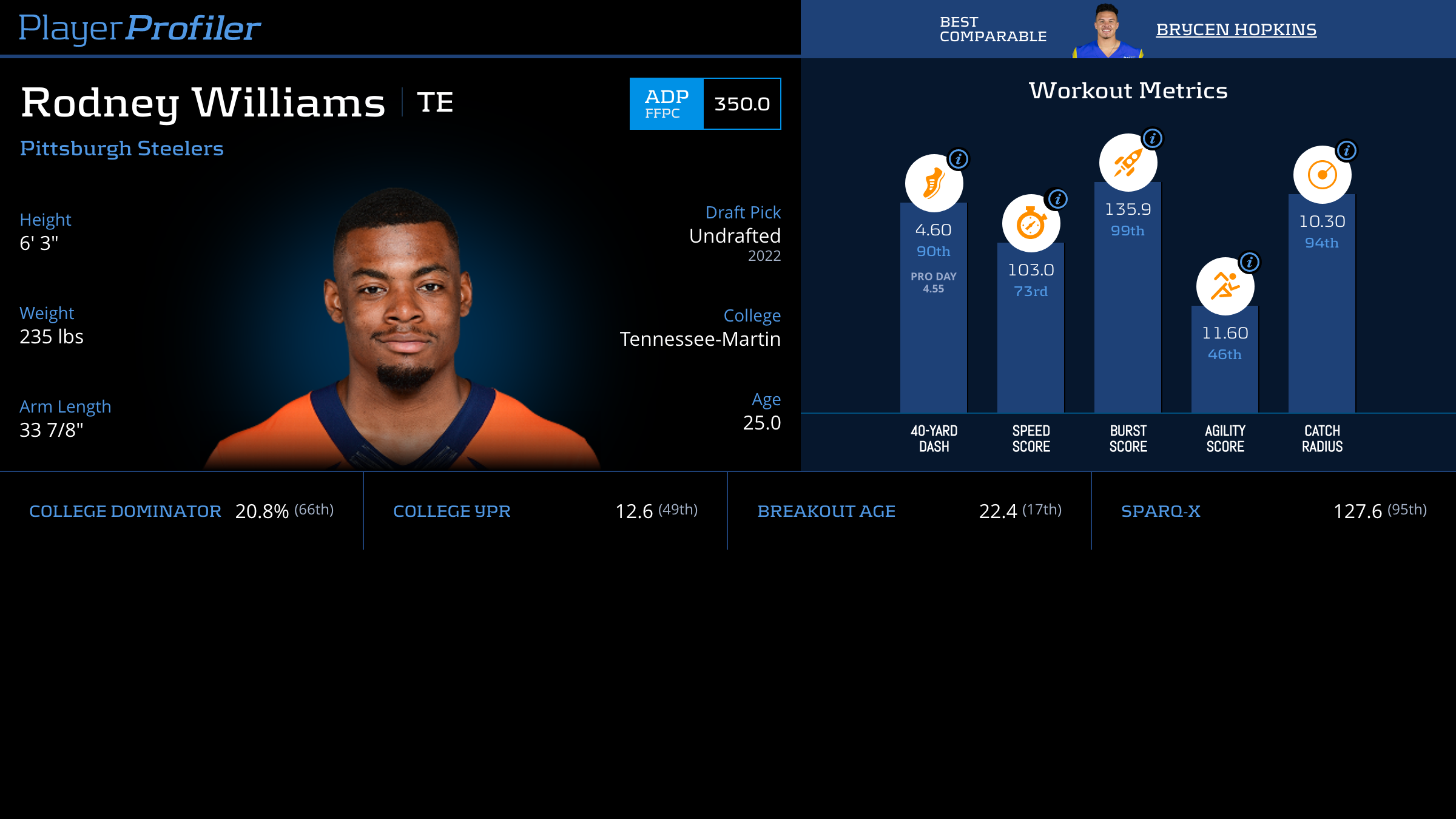 Box score statistics such as targets, yards, touchdowns, and fantasy points per target are updated the next day. Advanced stats and metrics are updated later in the week during the NFL season.