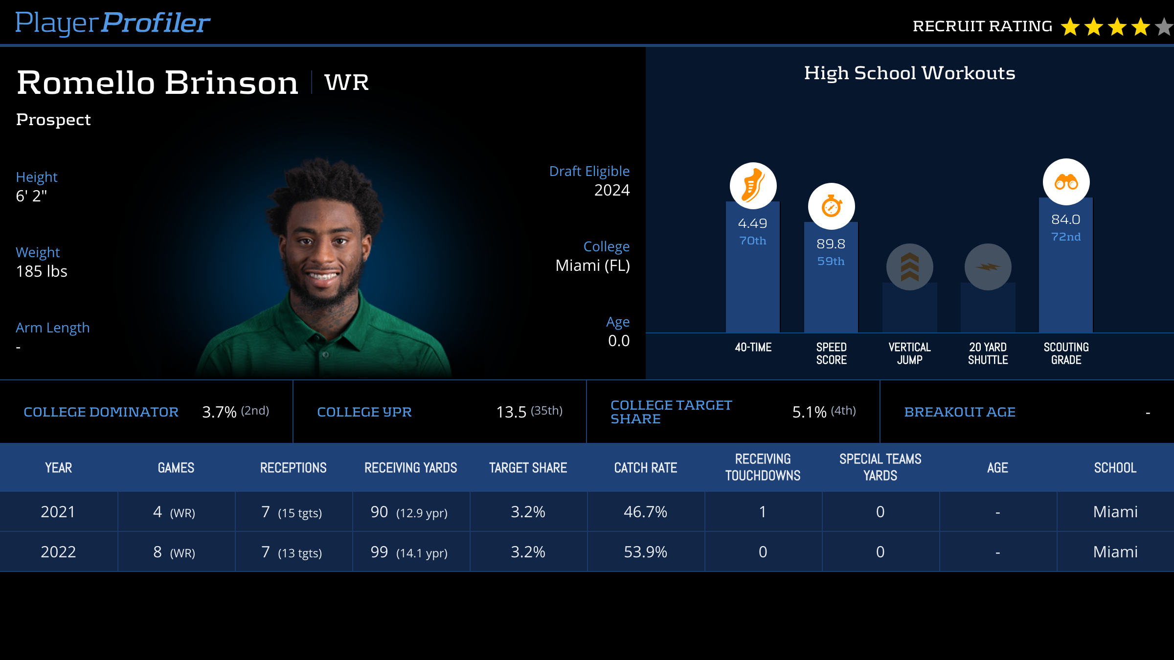 | Year Year | Games Games | Receptions Recs | Receiving Yards Rec Yds | Target Share Tgt Share | Catch Rate Catch Rate | Receiving Touchdowns Rec TDs | Special Teams Yards Special Teams | Age Age | School School |