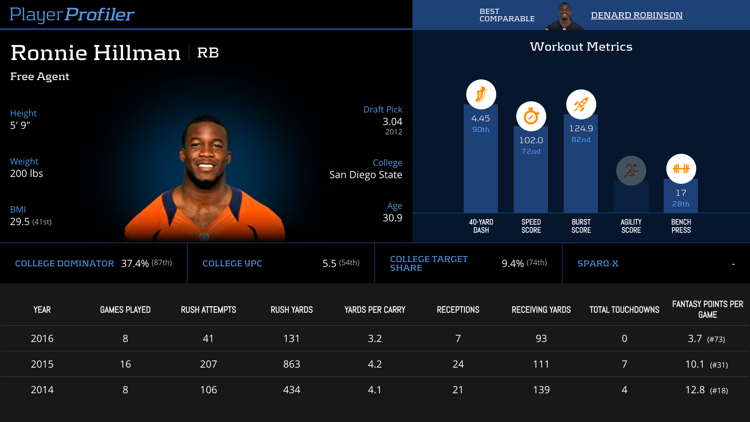 | Year Year | Games Games | Rush Attempts Rush Atts | Rushing Yards Rush Yrds | Total Touchdowns TDs | Receptions Rec | Receiving Yards Rec Yrds | Target Share Tgt Share | Age Age | School School |