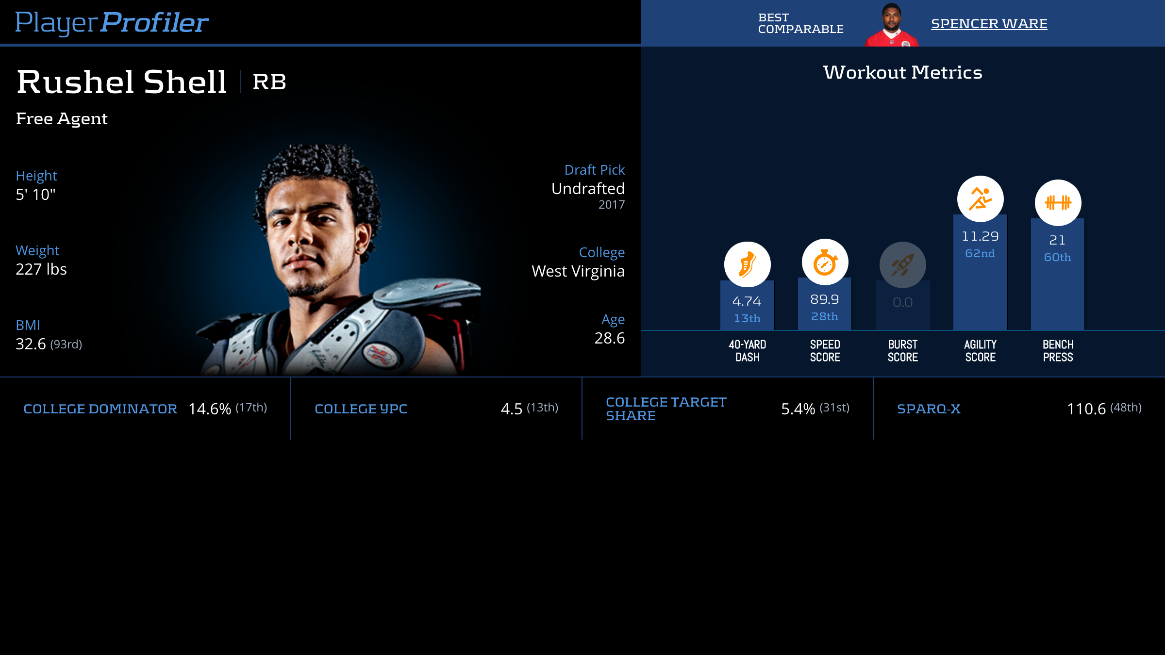 | Year Year | Games Games | Rush Attempts Rush Atts | Rushing Yards Rush Yrds | Total Touchdowns TDs | Receptions Rec | Receiving Yards Rec Yrds | Target Share Tgt Share | Age Age | School School |