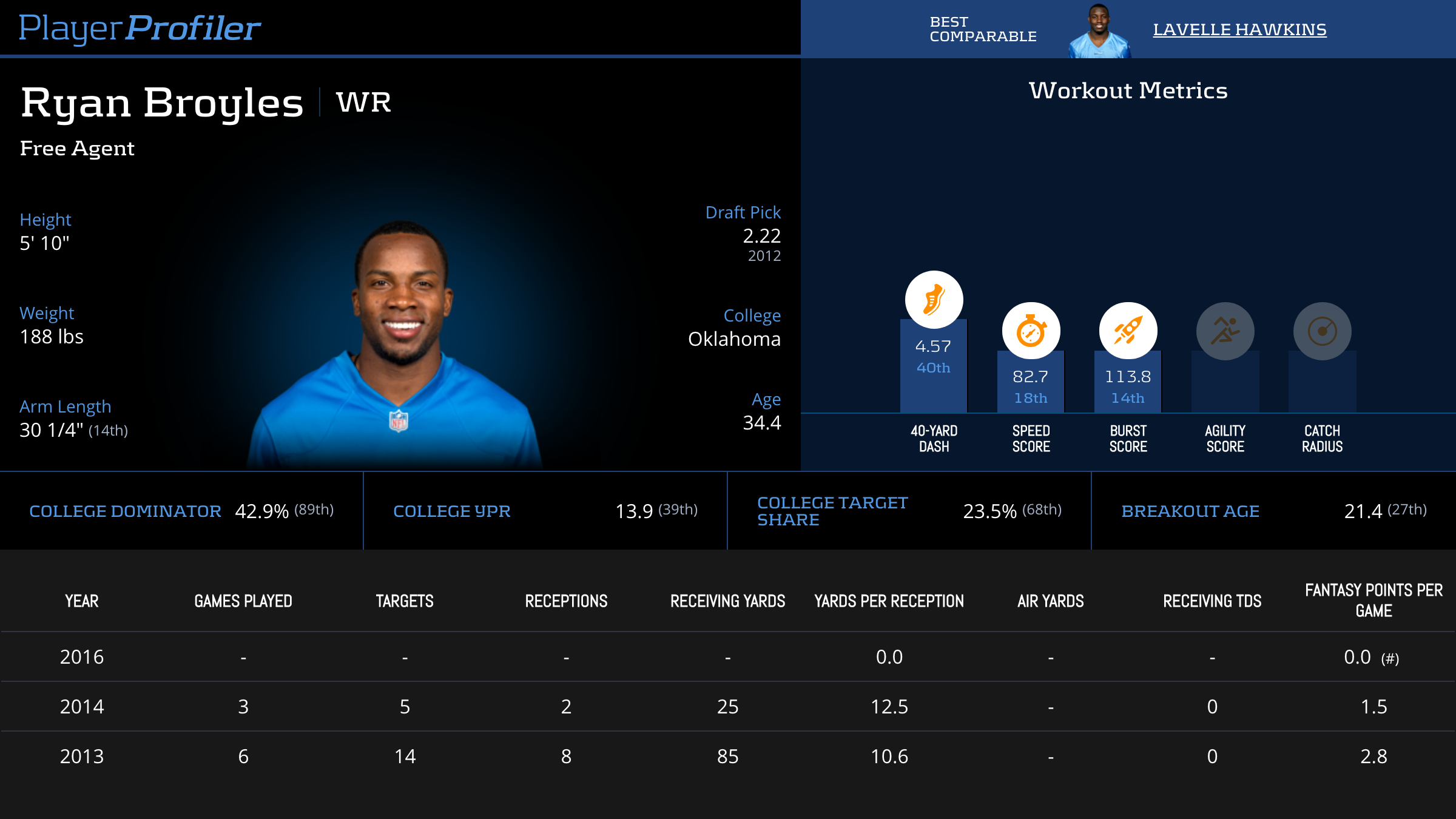 | Year Year | Games Games | Receptions Recs | Receiving Yards Rec Yds | Target Share Tgt Share | Catch Rate Catch Rate | Receiving Touchdowns Rec TDs | Special Teams Yards Special Teams | Age Age | School School |