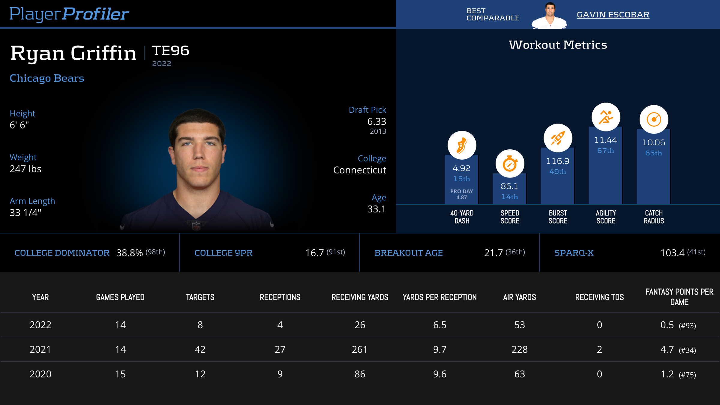 | Year Year | Games Games | Receptions Recs | Receiving Yards Rec Yds | Target Share Tgt Share | Catch Rate Catch Rate | Receiving Touchdowns Rec TDs | Special Teams Yards Special Teams | Age Age | School School |