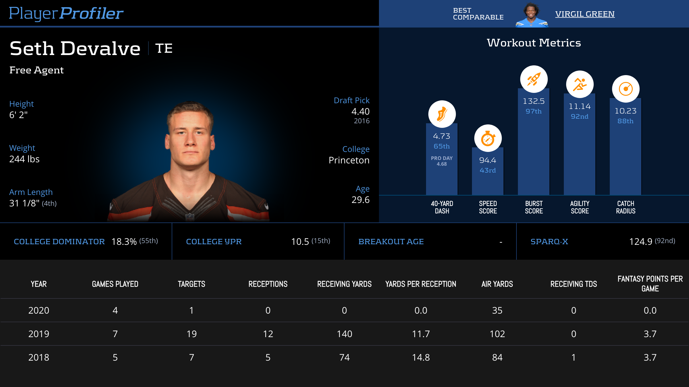 Value Over Stream: Valuation scheme calculates a player's fantasy pts/game over the average waiver wire replacement in standard fantasy league formats during either the current season (or previous year during the offseason) and adjusts for positional bust rates. VOS rank in parenthesis spans all positions, enabling player comparisons across QB's, RB's, WR's, and TE's.