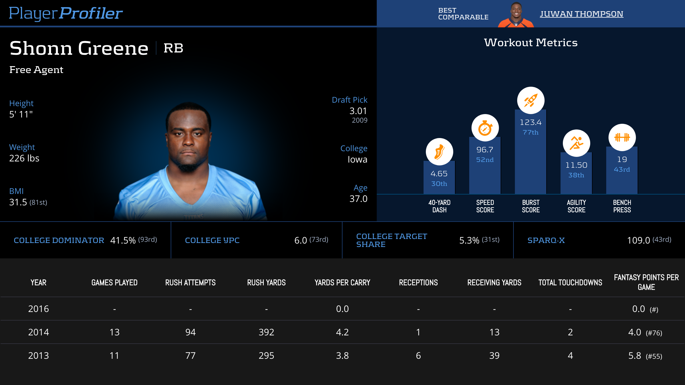 | Year Year | Games Games | Rush Attempts Rush Atts | Rushing Yards Rush Yrds | Total Touchdowns TDs | Receptions Rec | Receiving Yards Rec Yrds | Target Share Tgt Share | Age Age | School School |