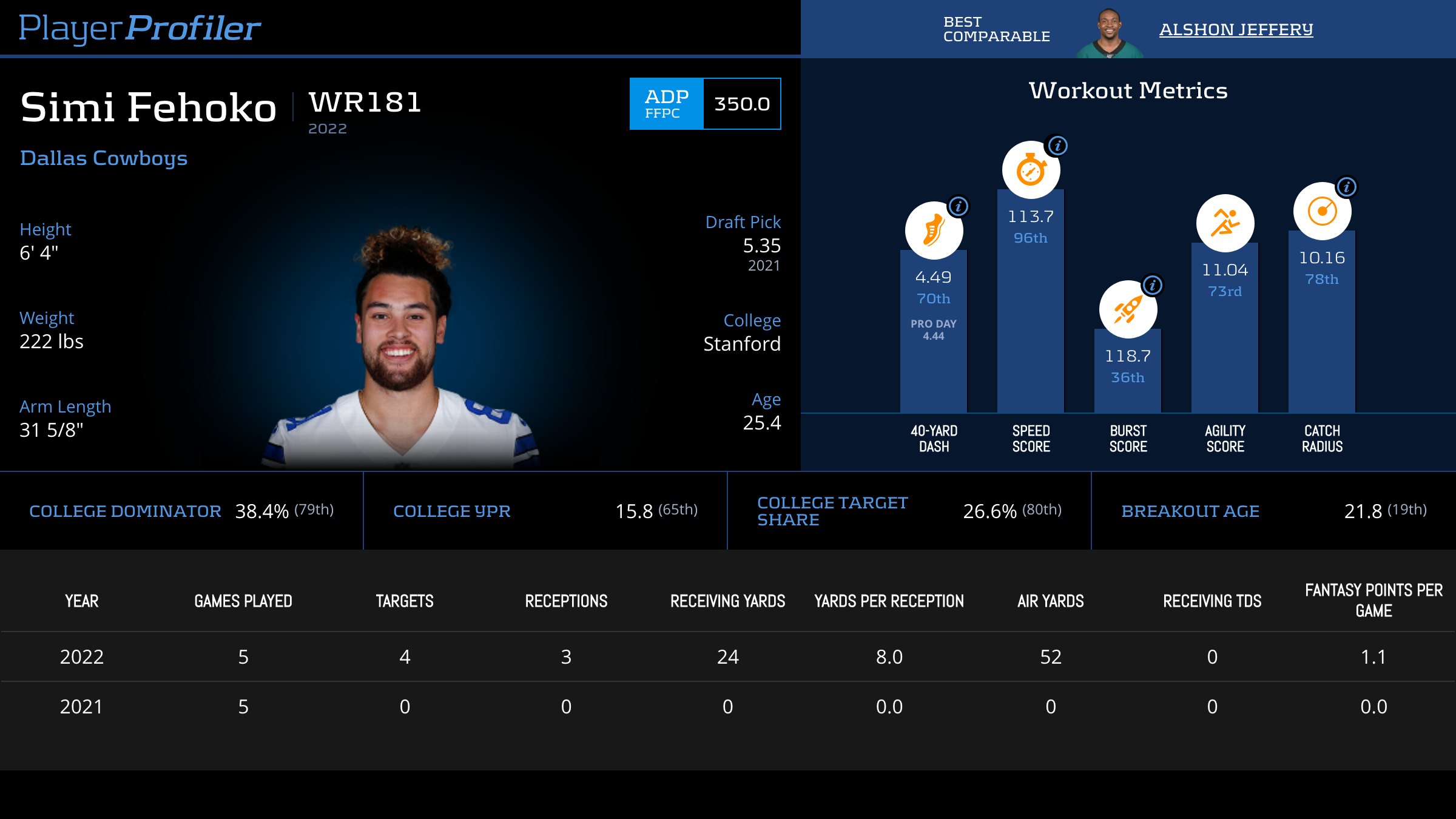 | Year Year | Games Games | Receptions Recs | Receiving Yards Rec Yds | Target Share Tgt Share | Catch Rate Catch Rate | Receiving Touchdowns Rec TDs | Special Teams Yards Special Teams | Age Age | School School |