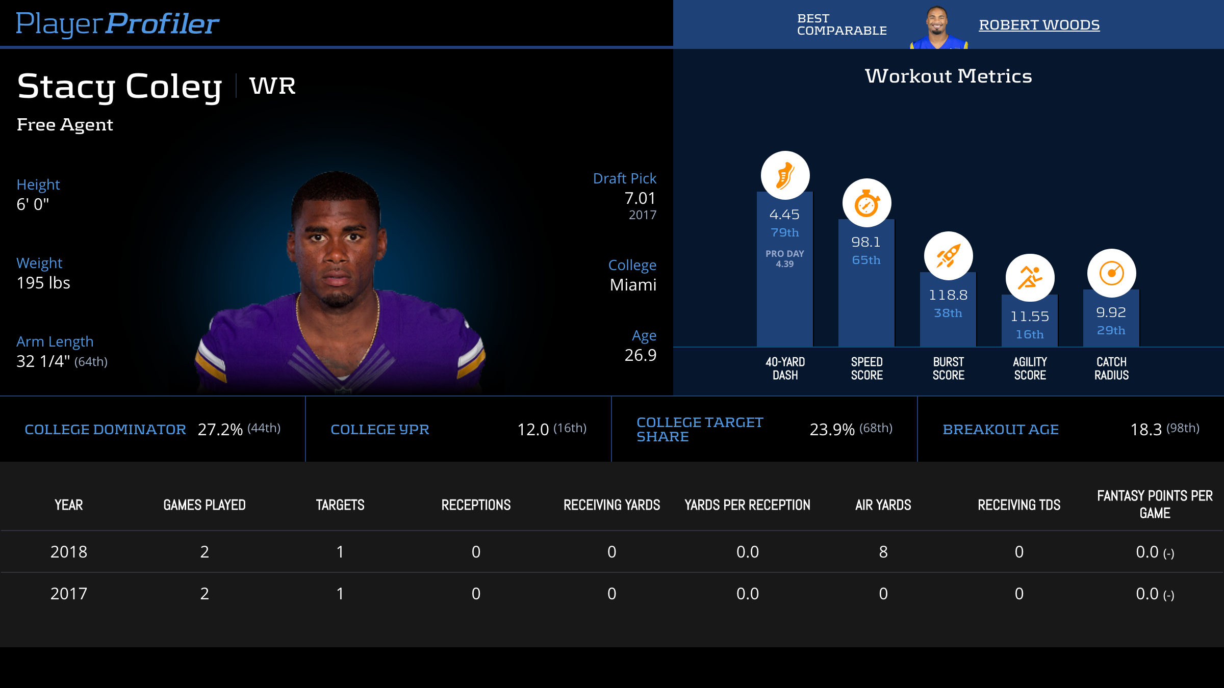 | Year Year | Games Games | Receptions Recs | Receiving Yards Rec Yds | Target Share Tgt Share | Catch Rate Catch Rate | Receiving Touchdowns Rec TDs | Special Teams Yards Special Teams | Age Age | School School |